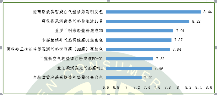 本次感官評價采用行業(yè)通行的測評方法,由9名具有氣墊粉底使用經驗,平均年齡在28歲的女性消費者,連續(xù)8天對高度關注的6個性能指標進行了測評,最終得到8個樣品感官評價綜合結果如下:
