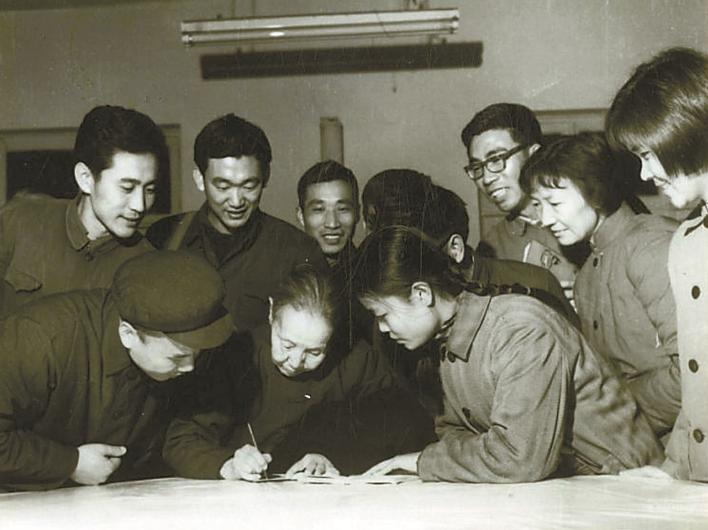 蘇曼華(右二)等人在兒童文學講習班學習時,圍著冰心先生請她簽名。(攝于1978年12月)