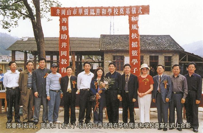 ▲蘇曼華(右四)、周善和(右七)在井岡山市華僑周善和學校奠基儀式上合影。