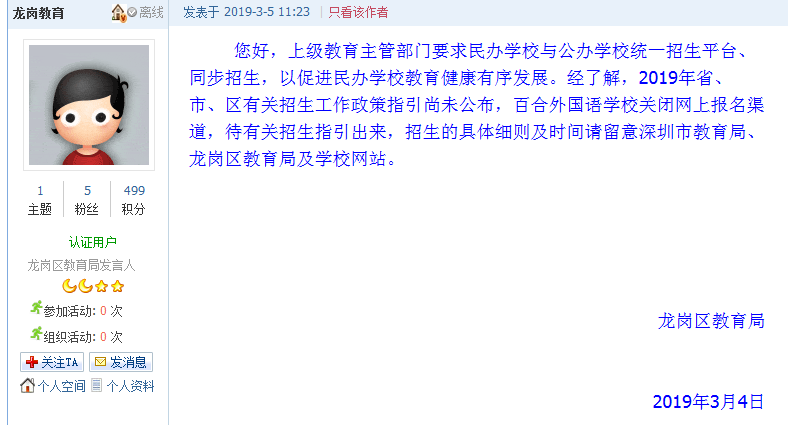3月5日11時(shí)23分,龍崗區(qū)教育局官方賬號(hào)發(fā)布回應(yīng)網(wǎng)帖,回應(yīng)稱(chēng)“上級(jí)教育主管部門(mén)要求民辦學(xué)校與公辦學(xué)校統(tǒng)一招生平臺(tái)、同步招生,以促進(jìn)民辦學(xué)校教育健康有序發(fā)展。”“2019年省、市、區(qū)有關(guān)招生工作政策指引尚未公布,百合外國(guó)語(yǔ)學(xué)校關(guān)閉網(wǎng)上報(bào)名渠道,待有關(guān)招生指引出來(lái),招生的具體細(xì)則及時(shí)間請(qǐng)留意深圳市教育局、龍崗區(qū)教育局及學(xué)校網(wǎng)站。”