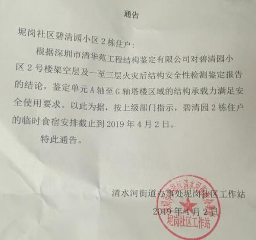 據(jù)記者從坭崗社區(qū)工作站公告了解到,經(jīng)專業(yè)鑒定樓房結(jié)構(gòu)承載力滿足安全使用要求,因此,碧清園2棟住戶的臨時(shí)食宿安排截止到4月2日。對(duì)于居民提出的室內(nèi)燒焦氣味的安全問題,通告內(nèi)容未作出解釋。