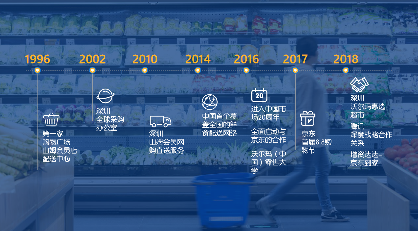 沃爾瑪于1996年在深圳開設(shè)中國第一家沃爾瑪購物廣場和山姆會(huì)員商店。進(jìn)駐中國20余年,擁有員工約10萬。沃爾瑪目前已經(jīng)在全國180多個(gè)城市開設(shè)了400多家商場、9家干倉配送中心和11家鮮食配送中心。沃爾瑪中國與超過7,000家供應(yīng)商建立了合作關(guān)系。