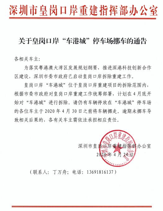 據(jù)了解,皇崗口岸“車港城”位于皇崗口岸重建項目的拆除范圍內(nèi),根據(jù)市委市政府對皇崗口岸重建工作統(tǒng)籌部署,計劃在4月底開始對“車港城”進(jìn)行拆除。請仍有車輛停放在“車港城”停車場的各位車主于2020年4月30日之前將車輛挪走,逾期未挪車導(dǎo)致相關(guān)后果的,各有關(guān)車主需依法承擔(dān)相應(yīng)責(zé)任。