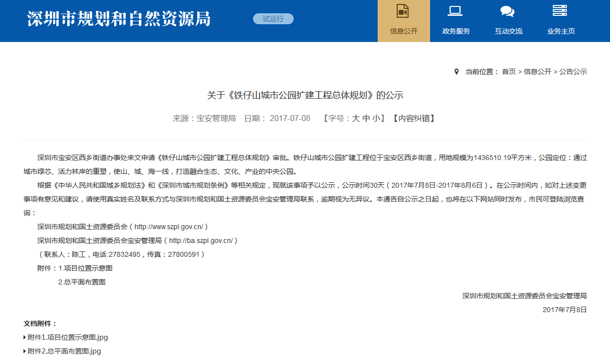 早在2017年,當時的市規(guī)土委曾經在官方網站發(fā)布了《關于<鐵仔山城市公園擴建工程總體規(guī)劃>的公示》:深圳市寶安區(qū)西鄉(xiāng)街道辦事處來文申請《鐵仔山城市公園擴建工程總體規(guī)劃》審批。鐵仔山城市公園擴建工程位于寶安區(qū)西鄉(xiāng)街道,用地規(guī)模為1436510.19平方米,公園定位:通過城市綠芯、活力林岸的重塑,使山、城、海一線,打造融合生態(tài)、文化、產業(yè)的中央公園。