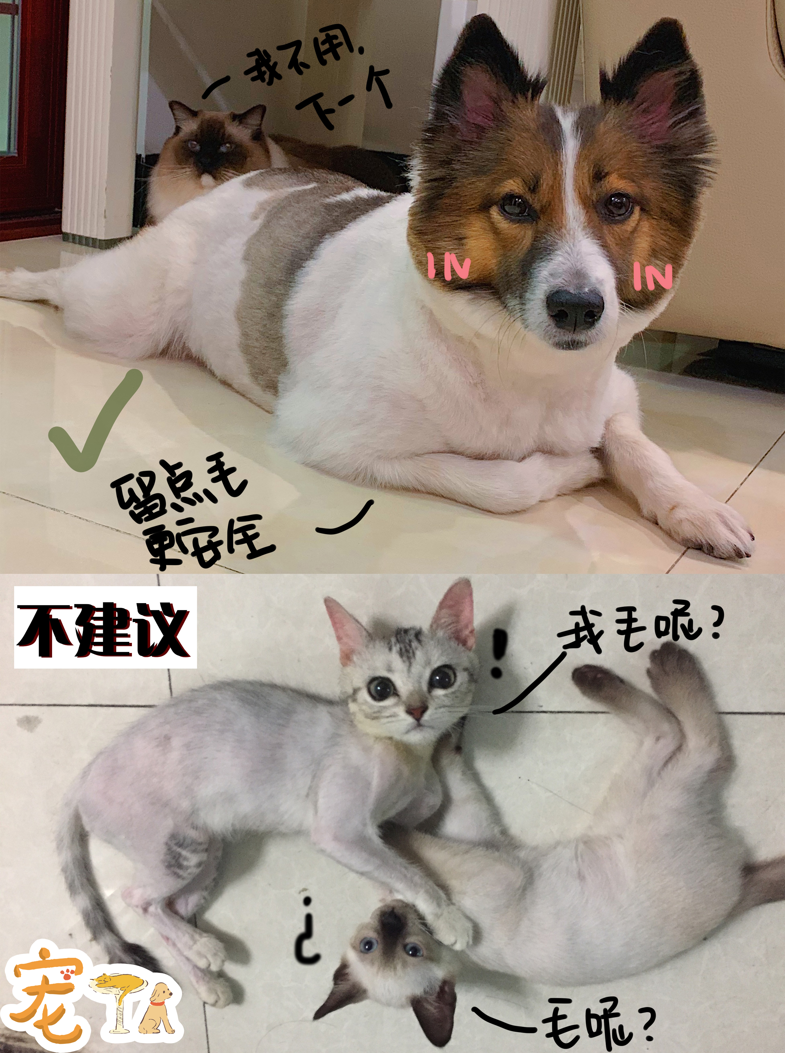 無論貓咪還是狗狗,或者兔子、倉鼠,剃毛都可能令他們受到驚嚇,或者因為自己“禿了”而受到心理傷害,如果自家“毛孩子”擁有敏感的性格,應(yīng)該在剪毛后對其安撫、夸贊;非必要情況下,不建議擅自給寵物剃毛。