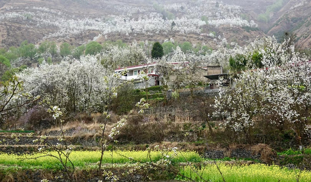 藏式民居與雪花梨花桃花相互掩映,美若仙境。李仁奇 攝