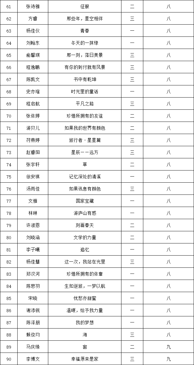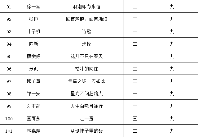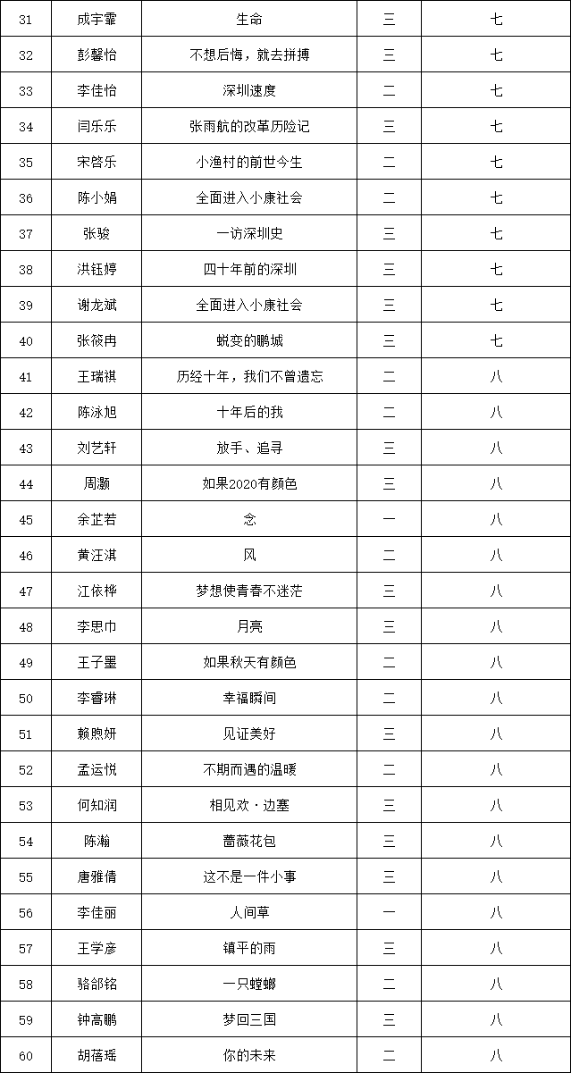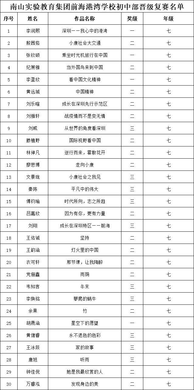 自2021年1月,活動(dòng)征稿啟動(dòng)以來,獲得了深圳市廣大中小學(xué)生、教師、文學(xué)愛好者的熱烈響應(yīng)積極參與,吸引了深圳百余所學(xué)校的上萬(wàn)人關(guān)注報(bào)名。現(xiàn)公布南山實(shí)驗(yàn)教育集團(tuán)前海港灣學(xué)校(初中部)專場(chǎng)晉級(jí)復(fù)賽名單如下: