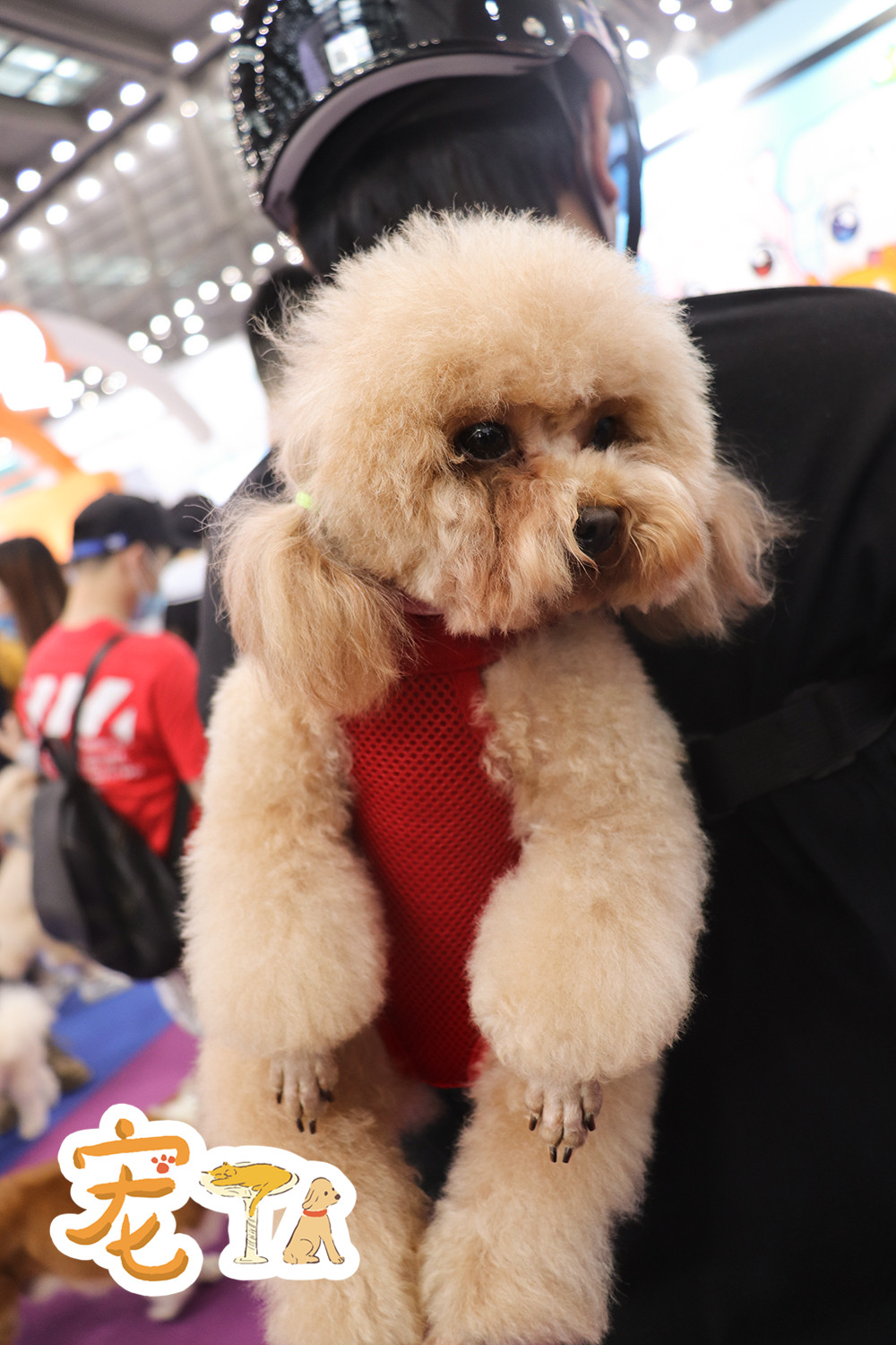 有家長(zhǎng)背著自家的寵物犬逛展。