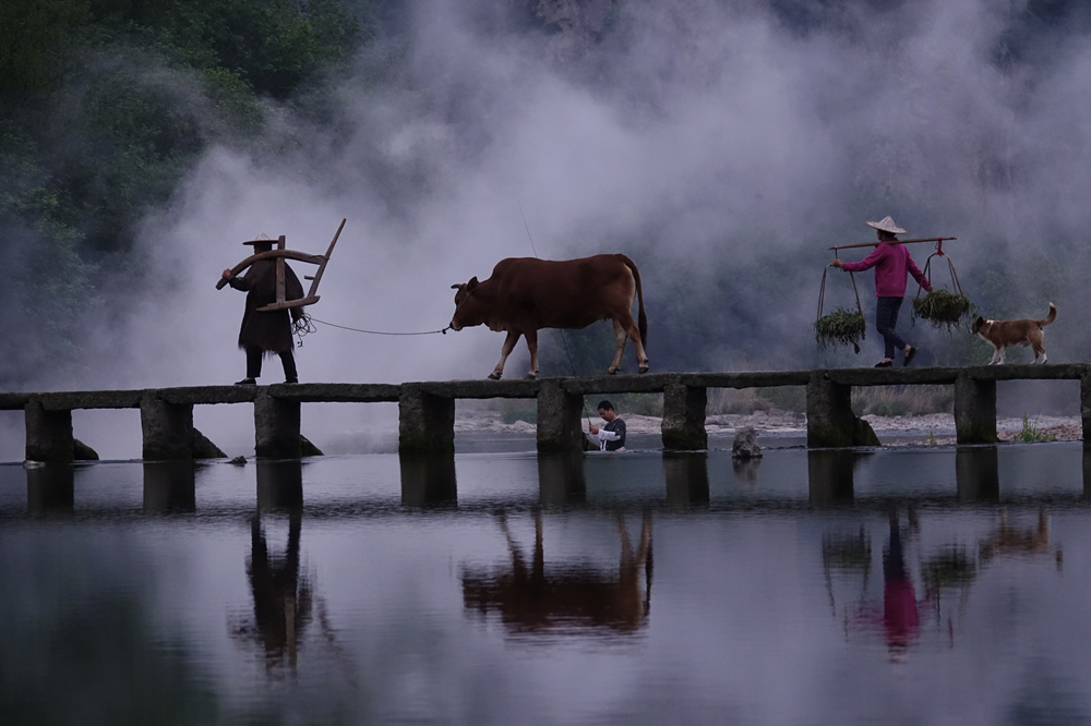 一對老夫妻一前一后,你牽著黃牛我挑著擔,還自帶云霧繚繞的背景,多么美麗的畫面。李仁奇 攝