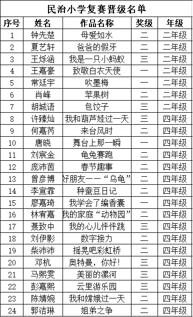 自2021年1月,活動征稿啟動以來,獲得了深圳市廣大中小學(xué)生、教師、文學(xué)愛好者的熱烈響應(yīng)積極參與,吸引了深圳百余所學(xué)校的上萬人關(guān)注報名。現(xiàn)公布龍華區(qū)民治小學(xué)晉級復(fù)賽名單如下: