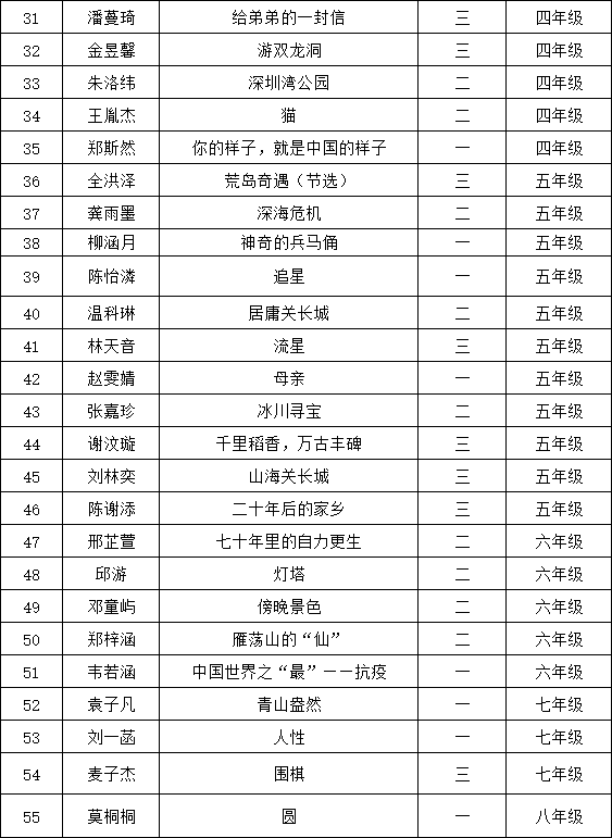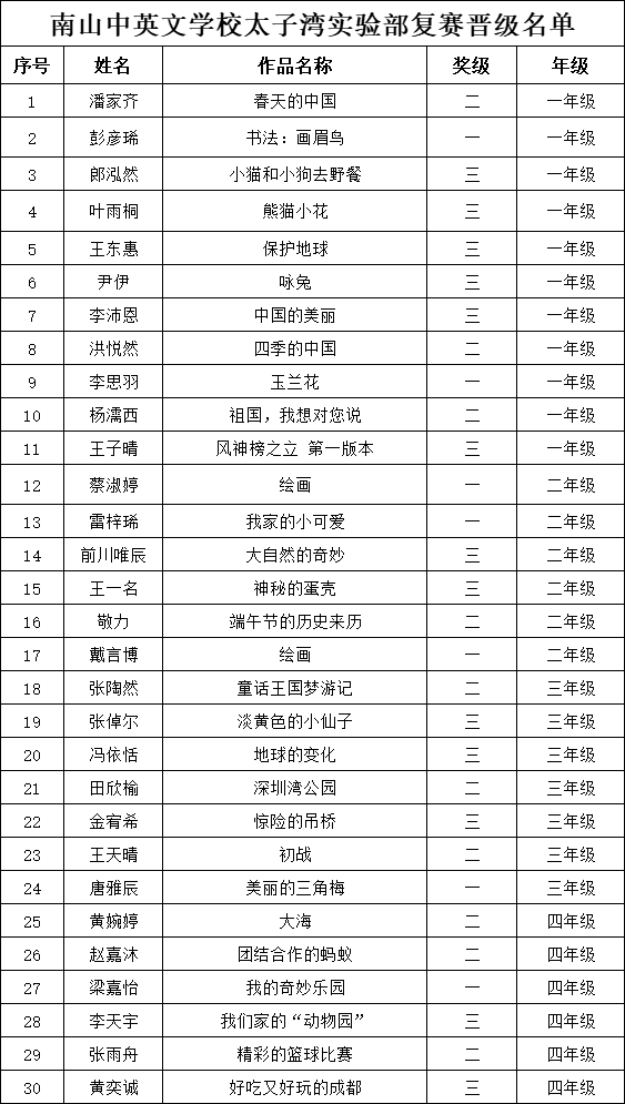 自2021年1月,活動征稿啟動以來,獲得了深圳市廣大中小學(xué)生、教師、文學(xué)愛好者的熱烈響應(yīng)積極參與,吸引了深圳百余所學(xué)校的上萬人關(guān)注報名?,F(xiàn)公布南山中英文學(xué)校太子灣實驗部晉級復(fù)賽名單如下: