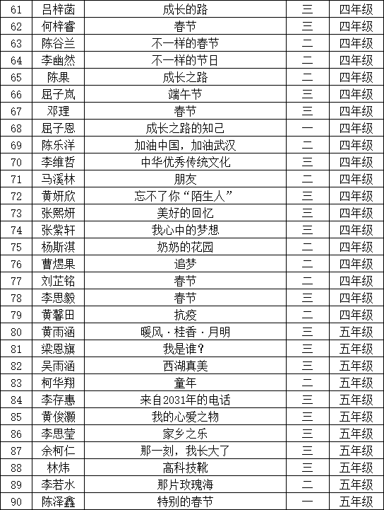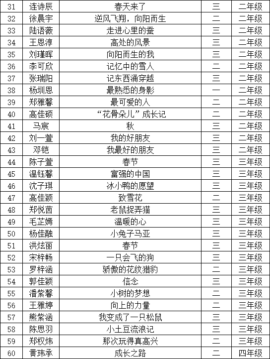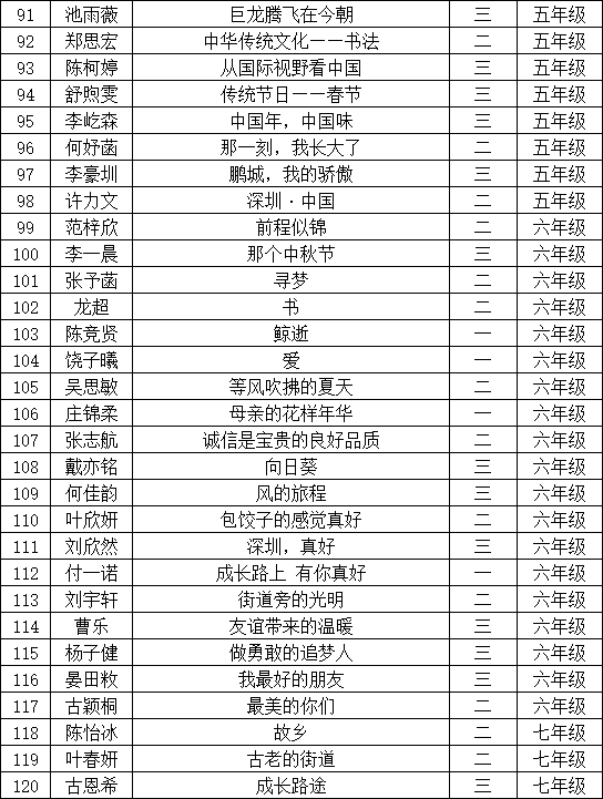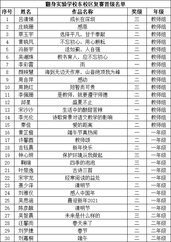 自2021年1月,活動征稿啟動以來,獲得了深圳市廣大中小學生、教師、文學愛好者的熱烈響應(yīng)積極參與,吸引了深圳百余所學校的上萬人關(guān)注報名?,F(xiàn)公布寶安區(qū)翻身實驗學校(東校區(qū))晉級復賽名單如下: