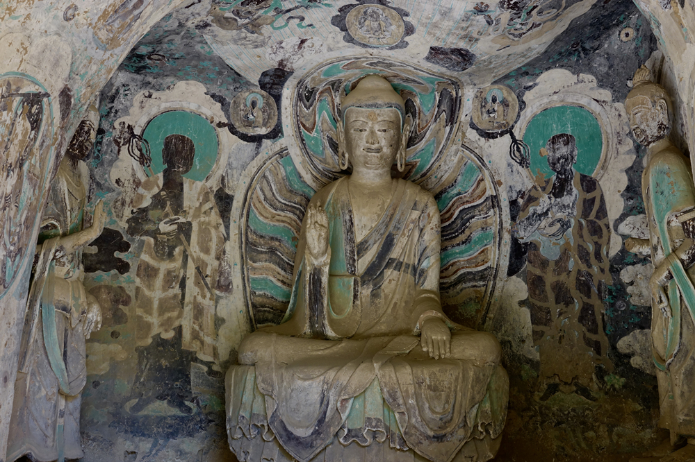 82窟,一結(jié)跏趺坐佛二脅侍菩薩,佛左右壁畫二弟子??唔敽烷T道露出底層,為北周原作,表層壁畫為明代重繪。李仁奇 攝