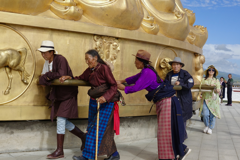 甘肅甘南藏族自治州瑪曲縣的寧瑪寺大藏經(jīng)轉(zhuǎn)經(jīng)筒矗立在金碧輝煌的寺院建筑群里,總投資4500萬元,歷經(jīng)四年,于2018年建成。筒體浮雕由尼泊爾工匠使用60公斤黃金手工鍛鑄鎏金而成。轉(zhuǎn)經(jīng)筒自身重量達320噸,內(nèi)裝大藏經(jīng)1008部共11萬冊。李仁奇 攝