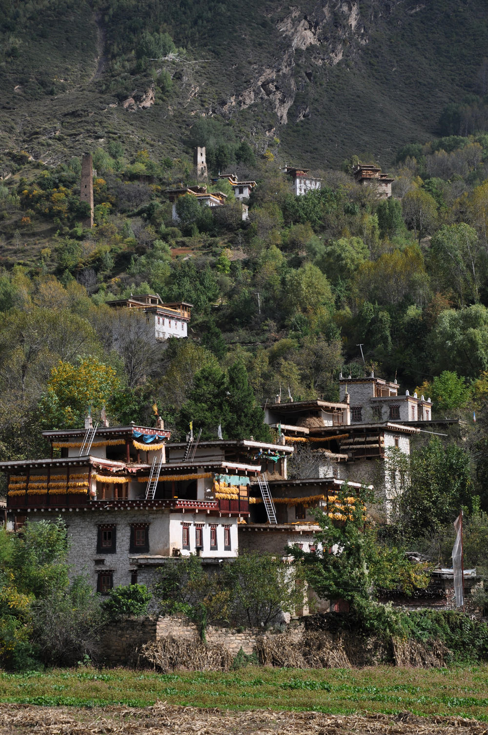 嘉絨藏民多居住在河谷或半山向陽(yáng)的寨子里。自古以來(lái),他們建就地取材建房,用黃泥作粘合劑,以石塊砌墻,以巨木為梁,橫搭雜木,蓋土于上,堅(jiān)固不漏。李仁奇 攝