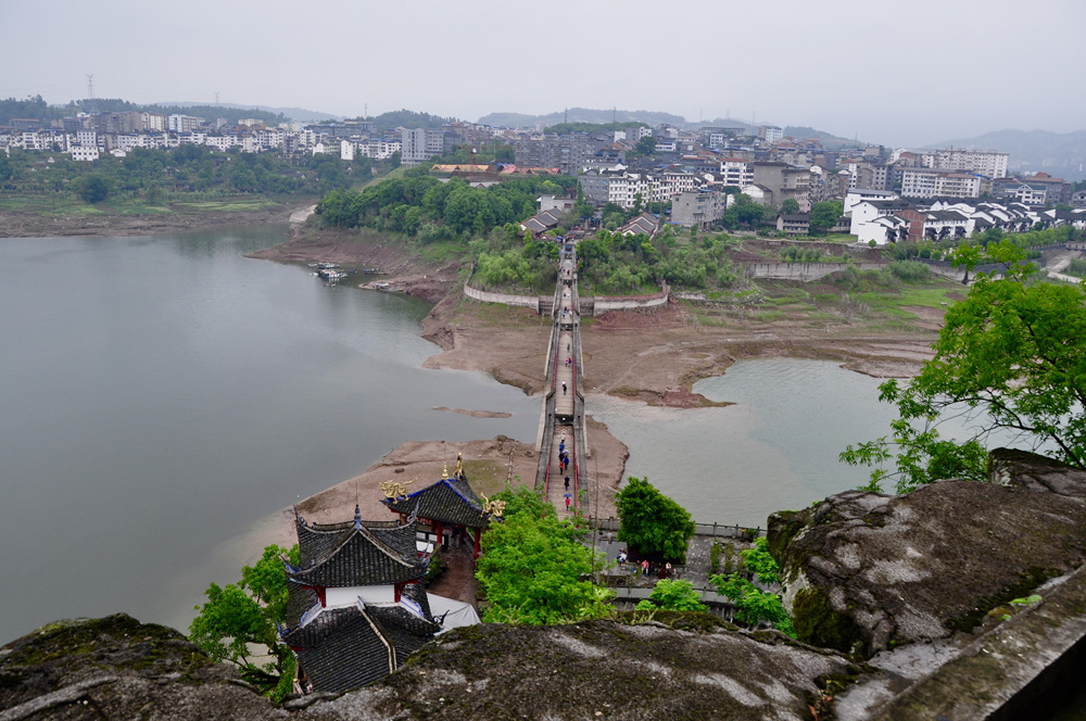 三峽庫區(qū)蓄水后,石寶寨被一道水泥圍堰保護(hù)起來,成為孤島,與江岸的聯(lián)系全憑一座吊橋,又被比喻為“世界最大的盆景”、“永不沉沒的航空母艦”。李仁奇 攝