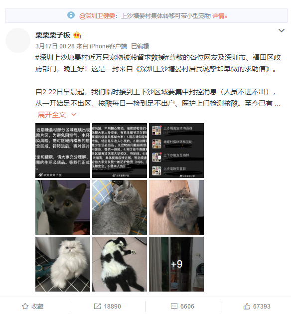 讀特客戶端·深圳新聞網(wǎng)2022年3月18日訊(記者 戰(zhàn)旗 陳蘇雅 劉詩瑾)3月16日,博主“栗栗栗子板”發(fā)布的一條微博沖上微博熱搜,深圳上沙塘晏村轉(zhuǎn)移的事件也被市民熱議,其中寵物去向的話題更是引發(fā)了人們的關(guān)注。