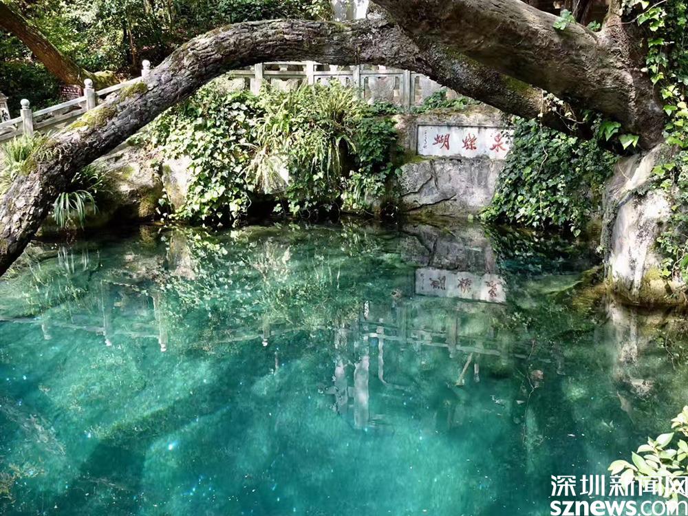 蝴蝶泉水清澈如鏡,水石相映,樹(shù)影搖晃。西壁上方鐫刻著郭沫若題寫(xiě)的“蝴蝶泉”三個(gè)大字。池邊的蝴蝶樹(shù),猶如一條青龍橫臥于泉池上。李仁奇 攝