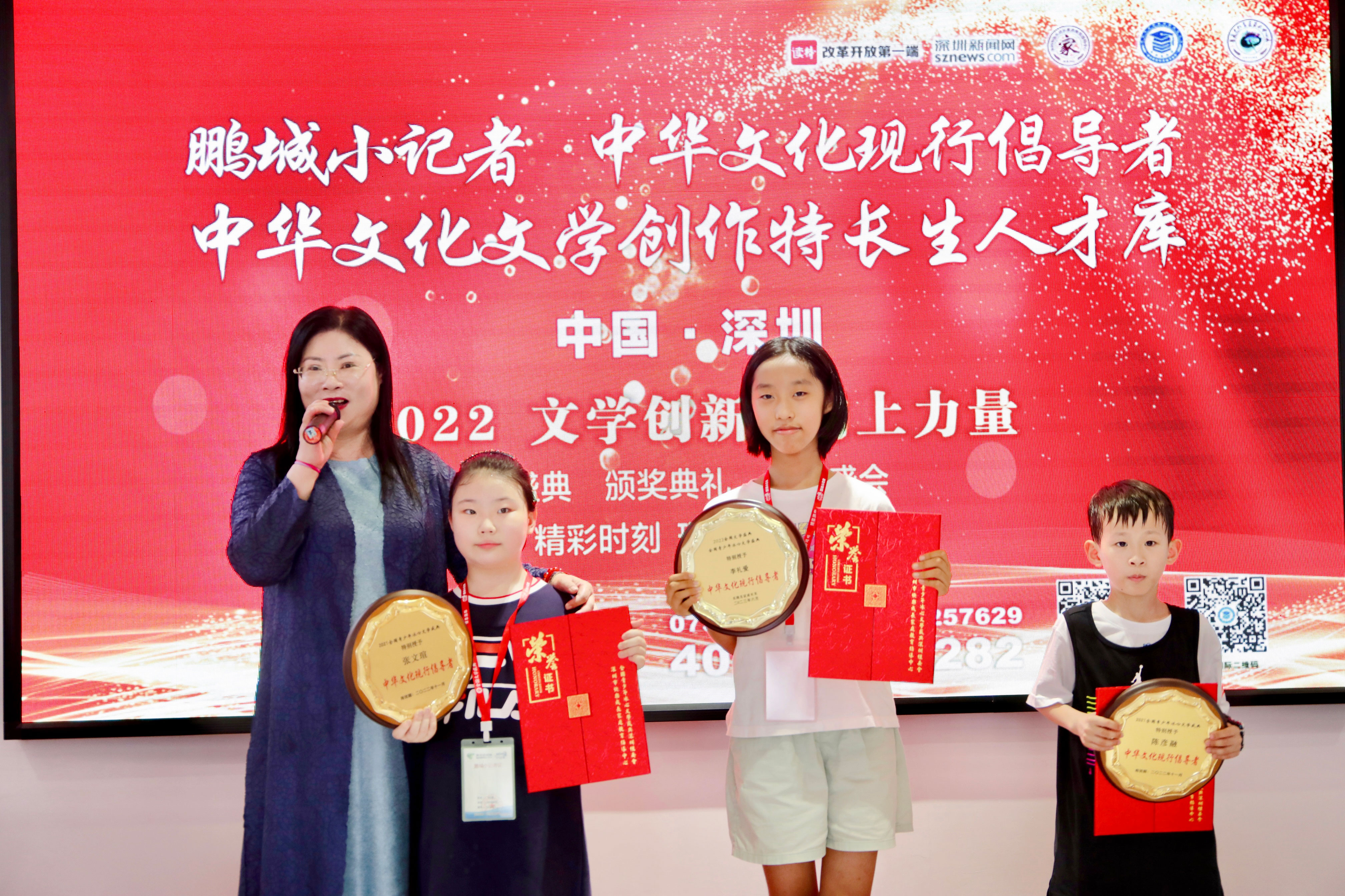 “中華文化現(xiàn)行倡導(dǎo)者”“中華文化文學(xué)特長生人才庫”和“鵬城小記者”的優(yōu)生代表與頒獎(jiǎng)嘉賓合影留念