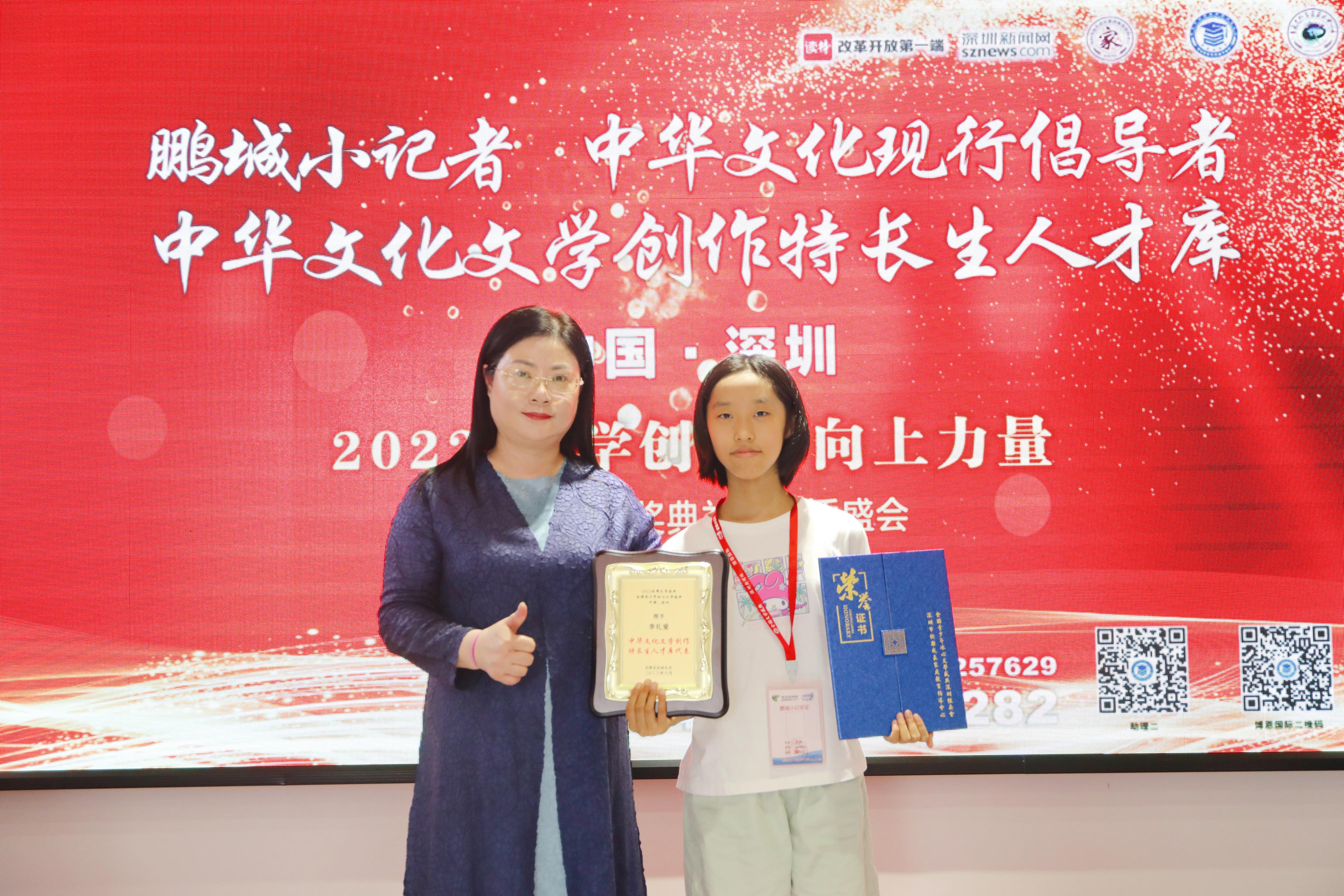 全國文學盛典聯(lián)合發(fā)起人、創(chuàng)始人肖硯寧與獲獎學生李禮愛合影