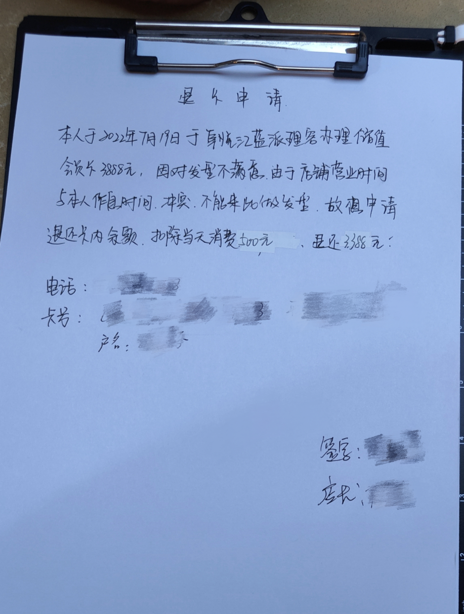 本人于2022年7月19日在該商家處花費(fèi)3888元充值會(huì)員卡,后因?qū)Πl(fā)型不滿(mǎn)意及店鋪營(yíng)業(yè)時(shí)間與本人作息時(shí)間沖突,故申請(qǐng)退還卡內(nèi)余額。商家于2023年4月25日同意在5個(gè)工作日內(nèi)退款,但一直拖延,至今仍未退款。