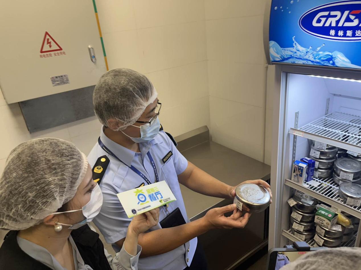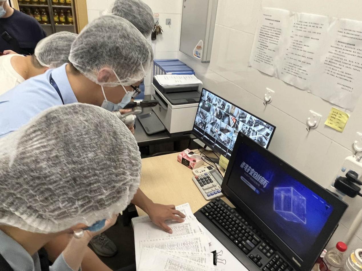 隨后,執(zhí)法人員一行進入食堂后廚,對面點間、儲藏間、清洗區(qū)、冷凍庫等各分區(qū)進行執(zhí)法檢查。經(jīng)查,后廚整體布局合理,其中食材存儲符合規(guī)定且日期均在保質期內;留樣冰箱內按規(guī)定保存了近期餐食樣品,留樣品名及時間標注清晰,確保了來源可追溯;清洗區(qū)分區(qū)明確,刀具砧板按照顏色管理,有效避免了交叉感染。此外,在后廚辦公室,執(zhí)法人員查看了索證索票落實情況及日管控、周排查、月調度等相關制度管理資料,各類信息管理較完善。