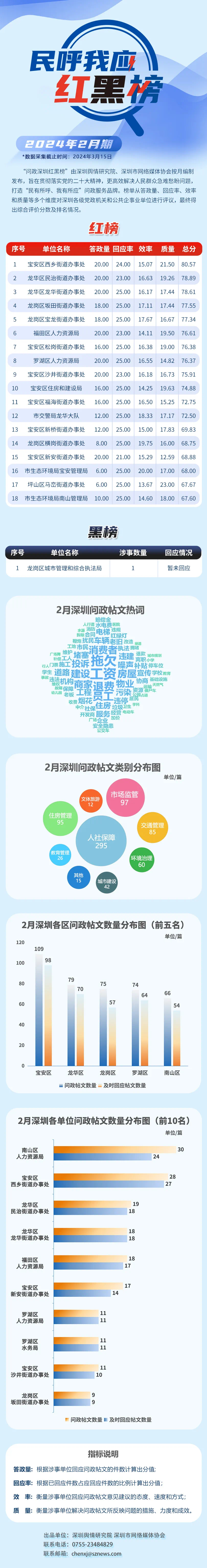 本期榜單采集的帖文主要來自深圳論壇、深圳各區(qū)政府官網(wǎng)、人民網(wǎng)領(lǐng)導(dǎo)留言板及深圳新聞網(wǎng)“民呼我應(yīng)”等平臺(tái),所采集帖文發(fā)布時(shí)間為2024年2月1日至2月29日,采集截止時(shí)間為2024年3月15日。榜單具有科學(xué)、合理、完備的綜合評價(jià)體系,能夠從答政量、回應(yīng)率、效率和質(zhì)量等多個(gè)維度對深圳各級黨政機(jī)關(guān)和公共企事業(yè)單位進(jìn)行評議。
