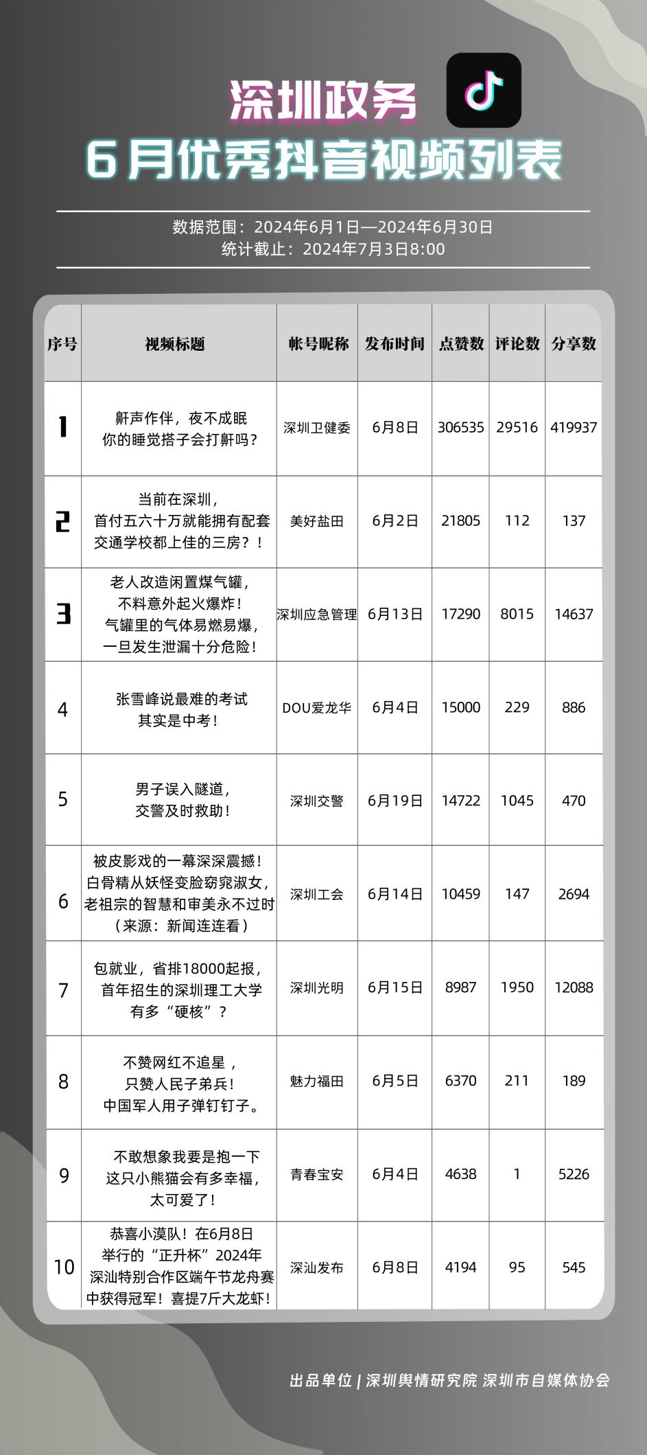 6月,深圳市衛(wèi)生健康委、福田區(qū)、市應(yīng)急管理局、市氣象局、龍崗區(qū)、龍華區(qū)、光明區(qū)、南山區(qū)、市交通警察局、市市場(chǎng)監(jiān)督管理局新媒體矩陣榮獲“深圳優(yōu)秀政務(wù)新媒體矩陣”。其中,市衛(wèi)生健康委新媒體矩陣依舊敢為人先,文風(fēng)別具一格,創(chuàng)意獨(dú)特新奇,在全市新媒體矩陣中走在前列,收獲了大量網(wǎng)民的喜愛,同時(shí)用戶黏性較強(qiáng),作品關(guān)注度高。福田區(qū)新媒體矩陣積極發(fā)布優(yōu)質(zhì)內(nèi)容,有關(guān)“封頂!它將是深圳第一高樓身邊的‘變形金剛’!”“不贊網(wǎng)紅不追星,只贊人民子弟兵!中國(guó)軍人用子彈釘釘子”等內(nèi)容通過不同角度強(qiáng)化了區(qū)域媒體的正面形象,取得了較好成效。