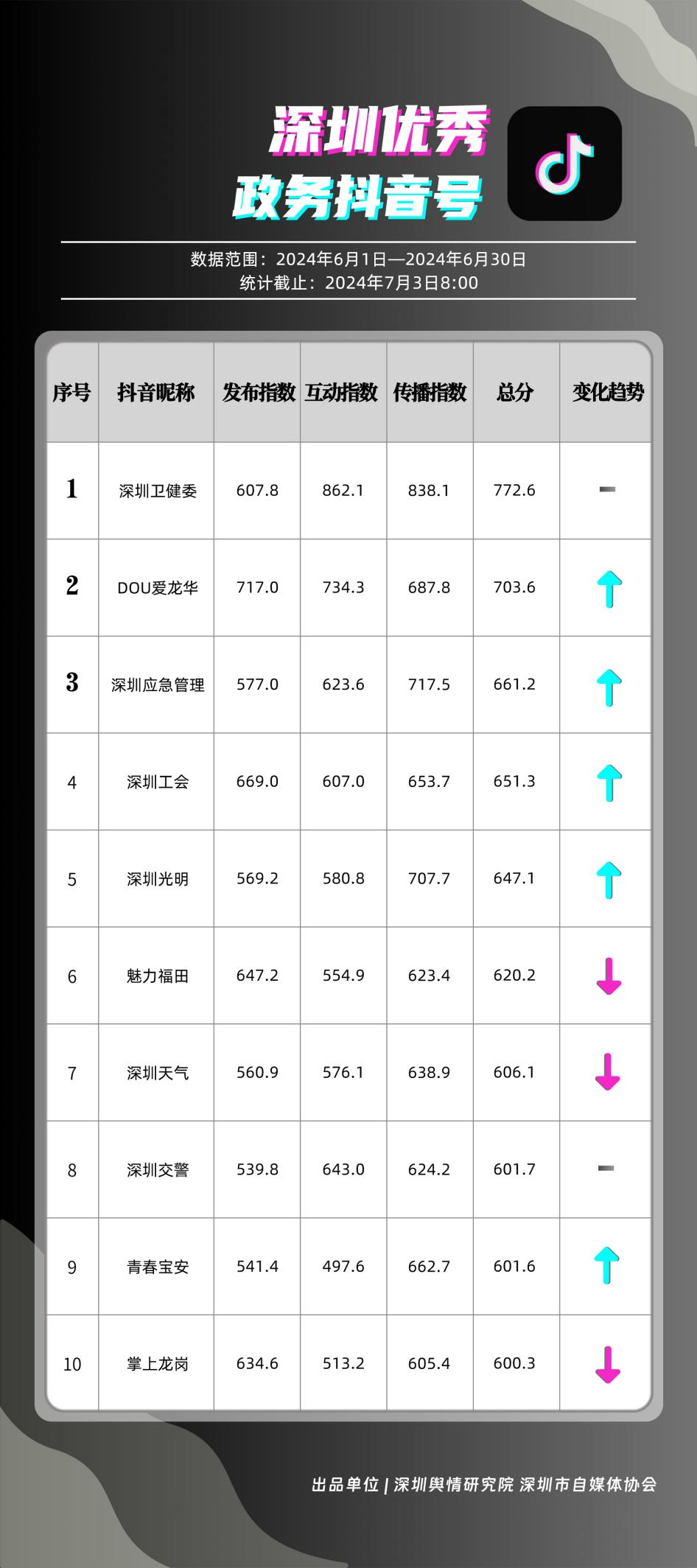 6月,“深圳衛(wèi)健委”“i深圳”“深圳龍崗發(fā)布”“幸福福田”“深圳交通”“深圳教育”“濱海寶安”“創(chuàng)新南山”“深圳工會(huì)”“青春深圳”“同心鵬城”“深圳光明”等30個(gè)政務(wù)微信公眾號(hào),被評(píng)為“深圳優(yōu)秀政務(wù)微信公眾號(hào)”。6月,“深圳衛(wèi)健委”因內(nèi)容策劃出色、受眾互動(dòng)活躍、作品火熱“出圈”等,榮登排行榜首位?!皠?chuàng)新南山”“同心鵬城”“深圳社保”“深圳教育”等上榜公眾號(hào)也積極創(chuàng)作優(yōu)質(zhì)作品,抓住時(shí)下熱點(diǎn)趨勢(shì),集中發(fā)揮政務(wù)媒體傳播力量,推動(dòng)了政務(wù)信息傳播工作提質(zhì)增效。