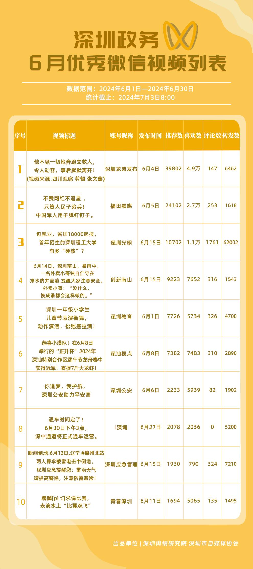 6月,政務(wù)微信視頻號(hào)“深圳光明”“福田融媒”“創(chuàng)新南山”“深圳教育”“深圳龍崗發(fā)布”“深汕觀點(diǎn)”“深圳工會(huì)”“深圳公安”“深圳應(yīng)急管理”和“青春深圳”榮獲“深圳優(yōu)秀政務(wù)微信視頻號(hào)”稱號(hào)。結(jié)合整體數(shù)據(jù)來看,6月深圳政務(wù)視頻號(hào)平臺(tái)推出多條爆款視頻,如《他不顧一切地奔跑去救人,令人動(dòng)容,事后默默離開!》《不贊網(wǎng)紅不追星,只贊人民子弟兵!中國(guó)軍人用子彈釘釘子》等作品,收獲了上萬的推薦數(shù)和喜歡數(shù),是政務(wù)信息傳播高效化和正能量傳播機(jī)制的體現(xiàn)。