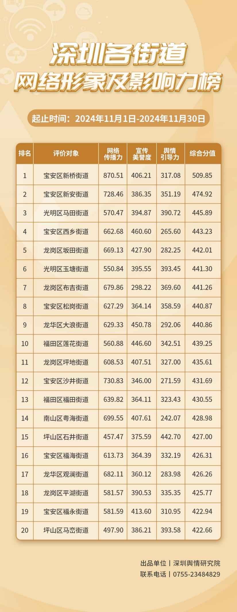 2024年11月,共有20個(gè)街道登上《深圳各街道網(wǎng)絡(luò)形象及影響力榜》,分別是:寶安區(qū)新橋街道、寶安區(qū)新安街道、光明區(qū)馬田街道、寶安區(qū)西鄉(xiāng)街道、龍崗區(qū)坂田街道、光明區(qū)玉塘街道、龍崗區(qū)布吉街道、寶安區(qū)松崗街道、龍華區(qū)大浪街道、福田區(qū)蓮花街道、龍崗區(qū)坪地街道、寶安區(qū)沙井街道、福田區(qū)福田街道、南山區(qū)粵海街道、坪山區(qū)石井街道、寶安區(qū)福海街道、龍華區(qū)觀瀾街道、龍崗區(qū)平湖街道、寶安區(qū)福永街道、坪山區(qū)馬巒街道。