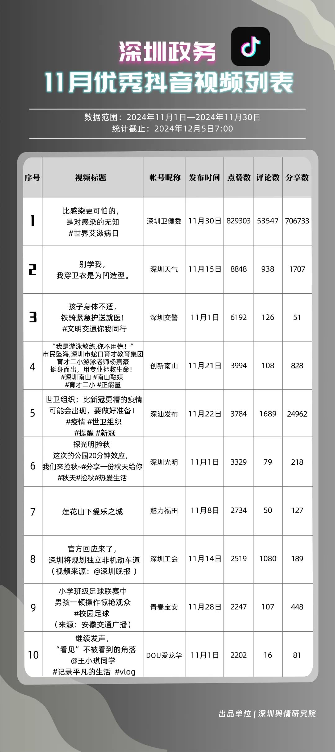 11月,“深圳衛(wèi)健委”“掌上龍崗”“深圳天氣”“深汕發(fā)布”“深圳工會”“深圳交警”“創(chuàng)新南山”“DOU愛龍華”“深圳光明”“中國前海”共10個政務(wù)抖音號獲得“深圳優(yōu)秀政務(wù)抖音號”稱號。“深圳衛(wèi)健委”憑借高質(zhì)量劇情內(nèi)容,巧妙融入健康知識,視頻累計收獲近百萬點贊。同時,“掌上龍崗”和“深圳天氣”也在視頻內(nèi)容創(chuàng)新上不斷探索,通過優(yōu)化宣傳策略和信息傳播方式,使得網(wǎng)民能夠在輕松愉快的氛圍中了解龍崗區(qū)的最新動態(tài)和深圳的天氣信息,展現(xiàn)了政務(wù)抖音號的獨特魅力與社會影響力。