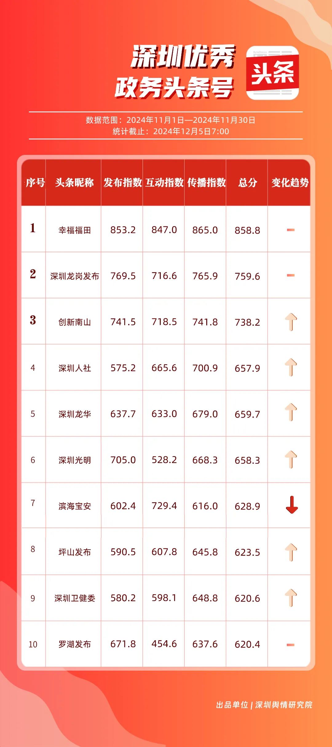 《深圳優(yōu)秀政務(wù)新媒體矩陣》2024年11月榜單揭曉,讓我們一同關(guān)注,哪些新媒體矩陣能夠憑借優(yōu)異表現(xiàn)嶄露新姿,成為加速政務(wù)傳播與服務(wù)創(chuàng)新發(fā)展的先鋒。