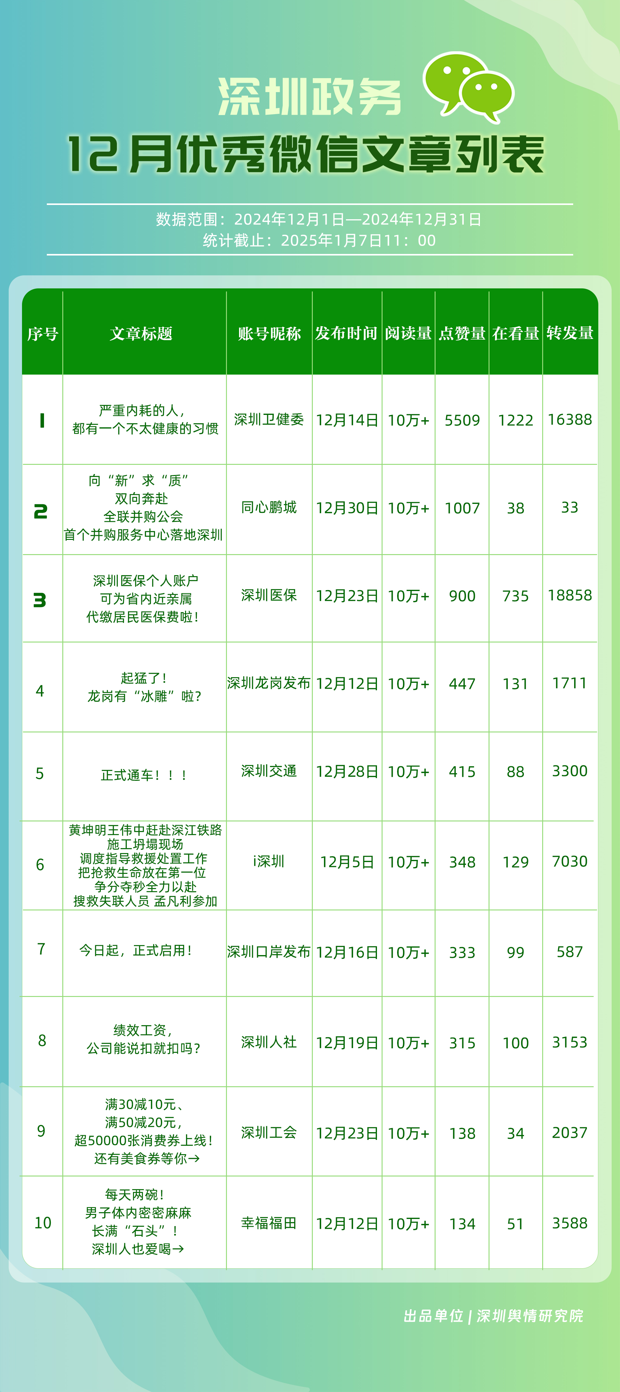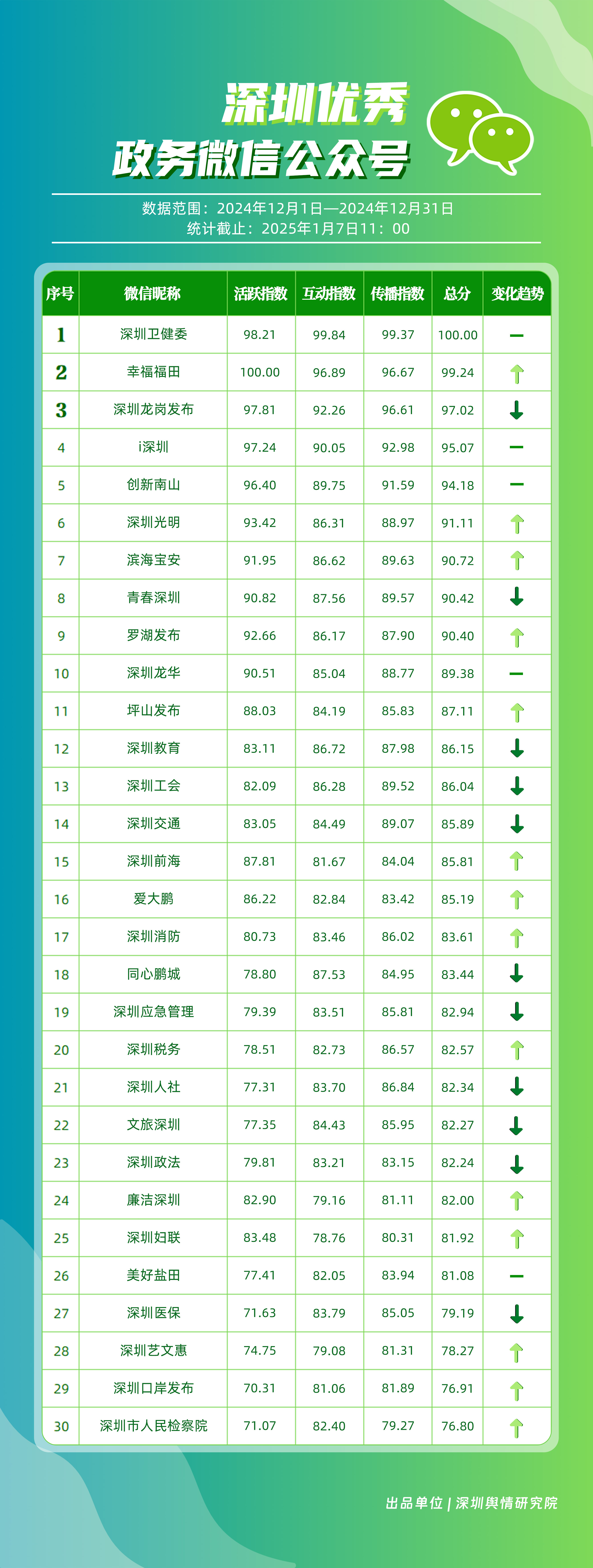 12月,“深圳衛(wèi)健委”“幸福福田”“深圳龍崗發(fā)布”“i深圳”“創(chuàng)新南山”“深圳光明”“濱海寶安”“青春深圳”“羅湖發(fā)布”“深圳龍華”等30個賬號入選“深圳優(yōu)秀政務微信公眾號”。其中,“深圳衛(wèi)健委”位于榜單首位,總分為100分?!靶腋8L铩薄吧钲诠饷鳌薄盀I海寶安”“羅湖發(fā)布”排名在本期有所提升,展現(xiàn)了他們不斷提升的傳播力、影響力?!癷深圳”“創(chuàng)新南山”則保持了穩(wěn)定的排名,持續(xù)在政務信息宣傳中發(fā)揮著重要作用。