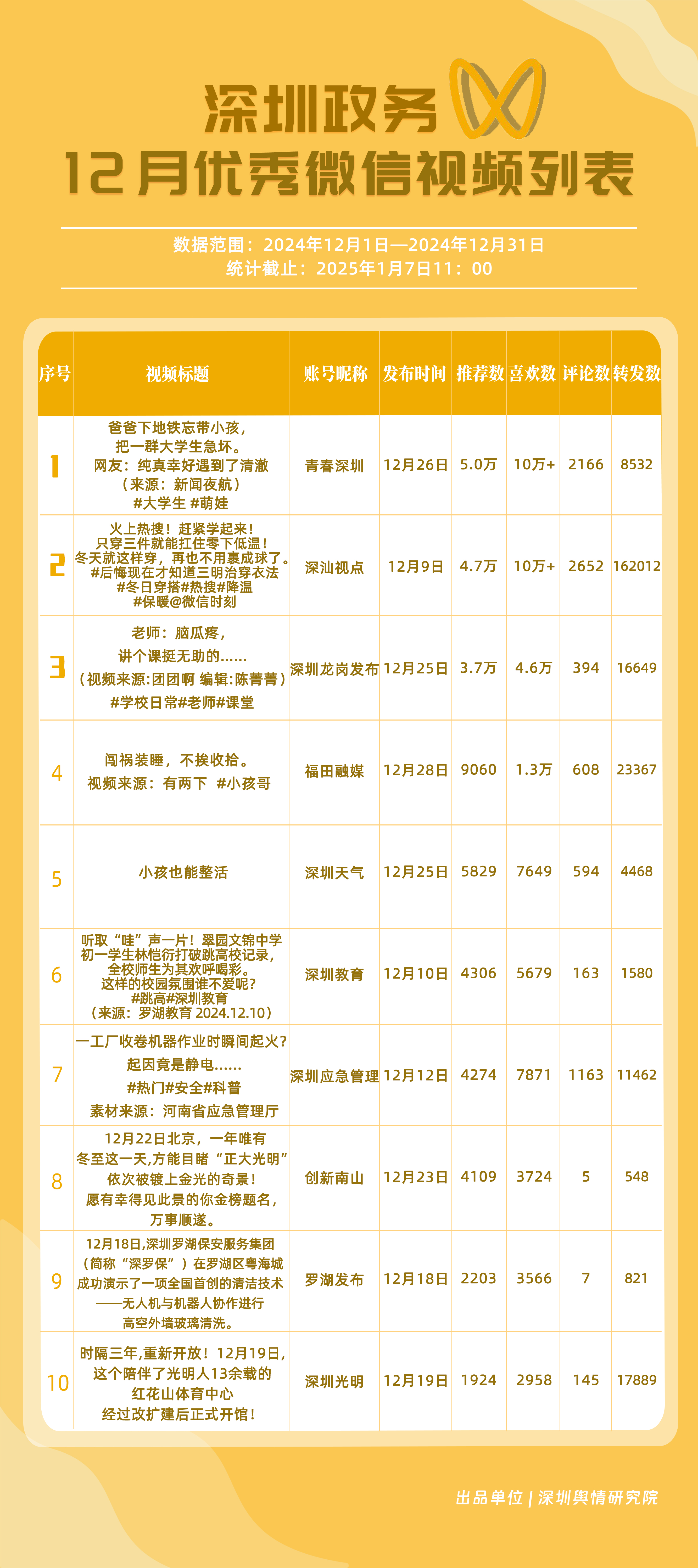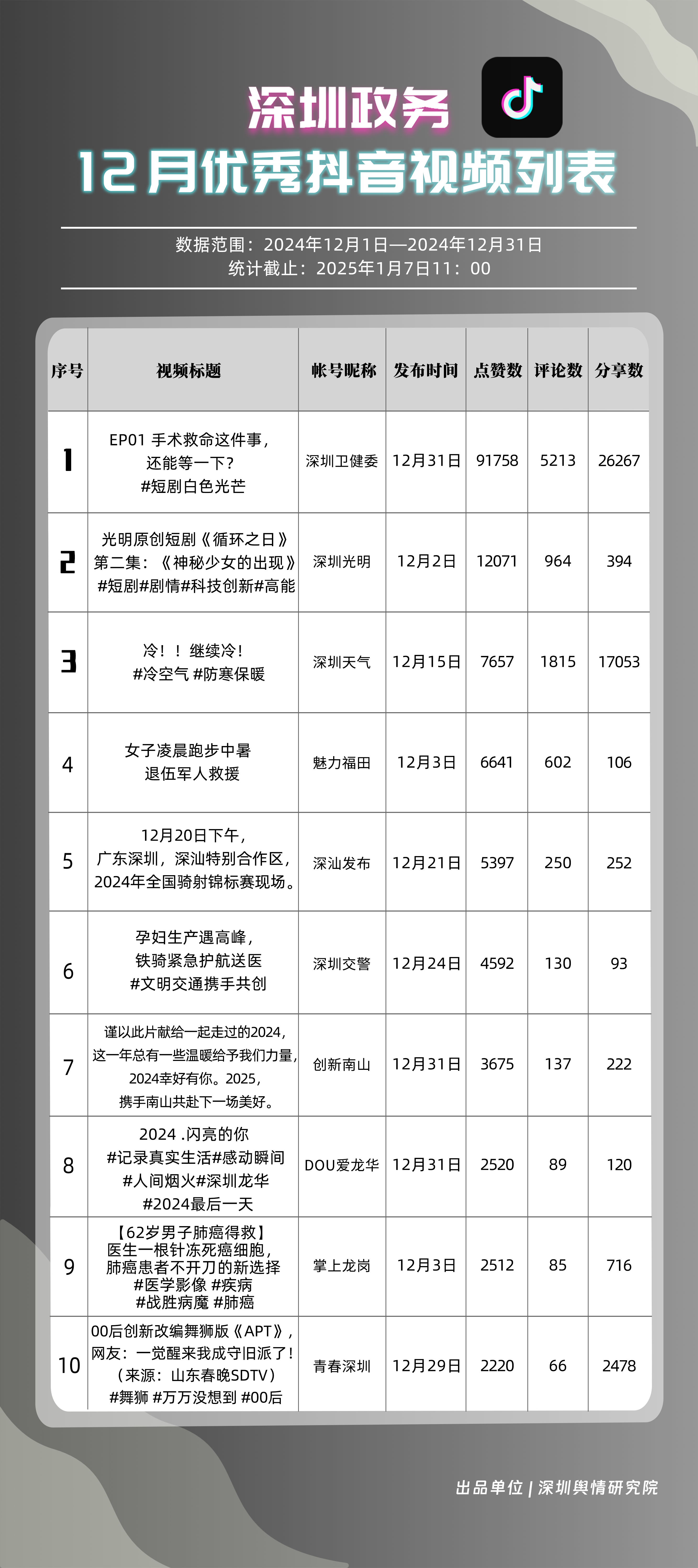 12月,“深圳衛(wèi)健委”“深圳天氣”“深汕發(fā)布”“掌上龍崗”“深圳光明”“DOU愛龍華”“魅力福田”“青春深圳”“深圳交警”“深圳工會”共10個政務抖音號獲得“深圳優(yōu)秀政務抖音號”稱號?!吧钲谛l(wèi)健委”在互動、傳播方面成績優(yōu)異,助推其位于榜單首位?!吧钲谔鞖狻薄吧钌前l(fā)布”“掌上龍崗”則各有所長,綜合排名位于榜單前列,內(nèi)容產(chǎn)出豐富、用戶互動高頻,信息傳播廣泛,共同展現(xiàn)了政務抖音號在服務公眾、提升信息傳播效能方面的顯著效能。