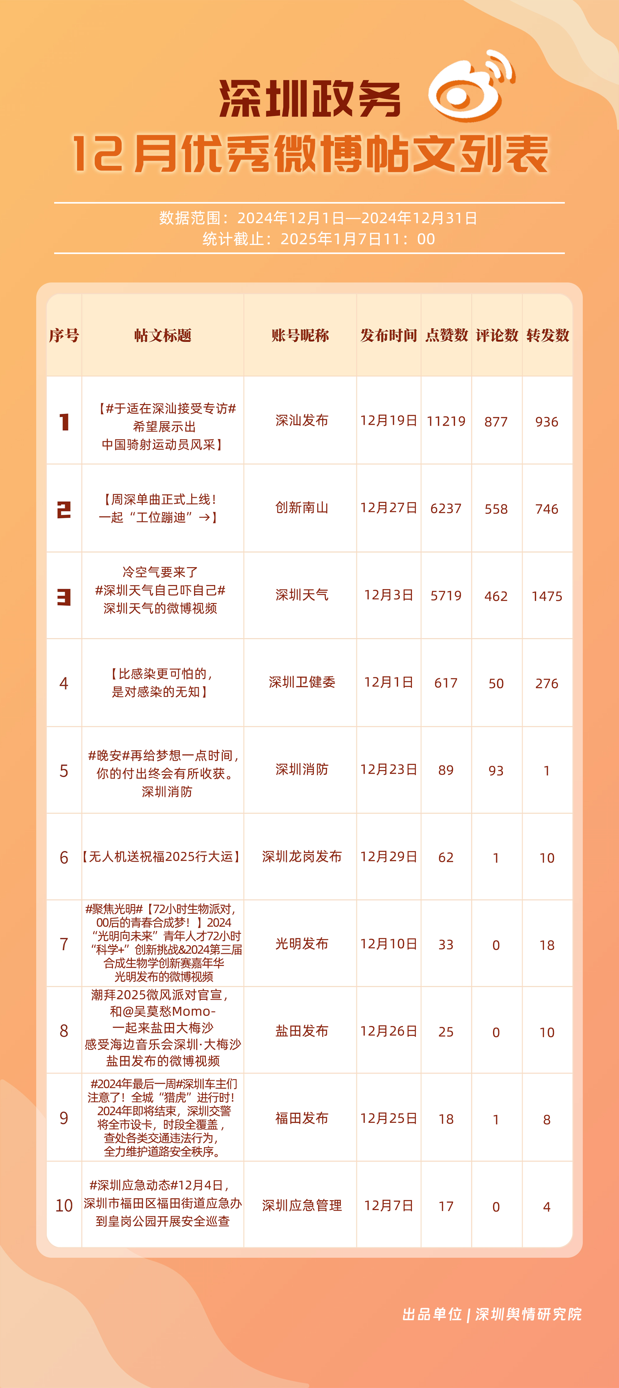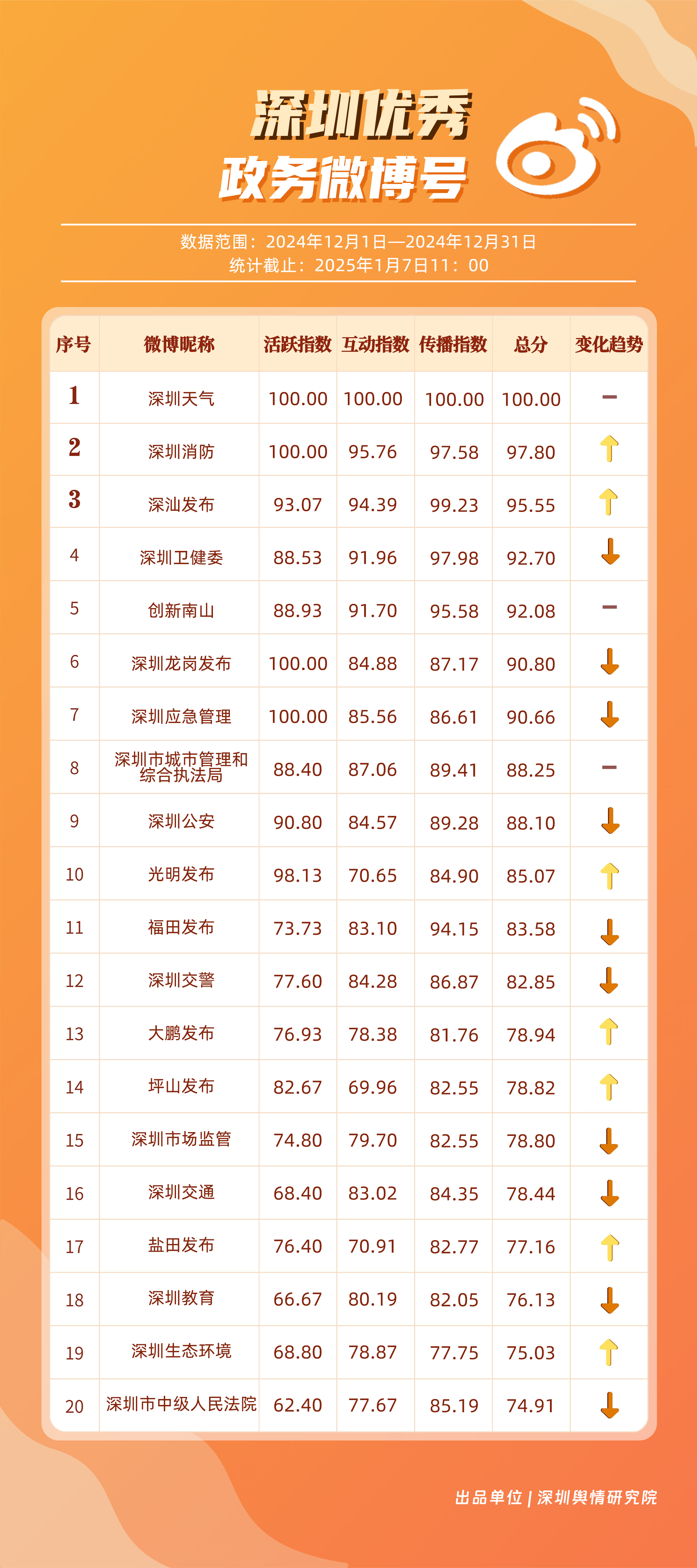 12月,“深圳天氣”“深圳消防”“深汕發(fā)布”“深圳衛(wèi)健委”“創(chuàng)新南山”“深圳龍崗發(fā)布”“深圳應急管理”“深圳市城市管理和綜合執(zhí)法局”“深圳公安”“光明發(fā)布”等20個賬號入選“優(yōu)秀政務微博號”。“深圳天氣”獲得滿分,“深圳消防”“深汕發(fā)布”賬號總分均超95分,位于榜單前三名。同時,“深圳衛(wèi)健委”“創(chuàng)新南山”“深圳龍崗發(fā)布”及“深圳應急管理”等賬號憑借對熱點的敏銳捕捉與信息的及時發(fā)布,總分在90分以上,體現(xiàn)出各自在提升公眾信息獲取質(zhì)量方面的不懈努力,彰顯了政務微博賬號在政民連接、信息共享等方面的巨大價值。
