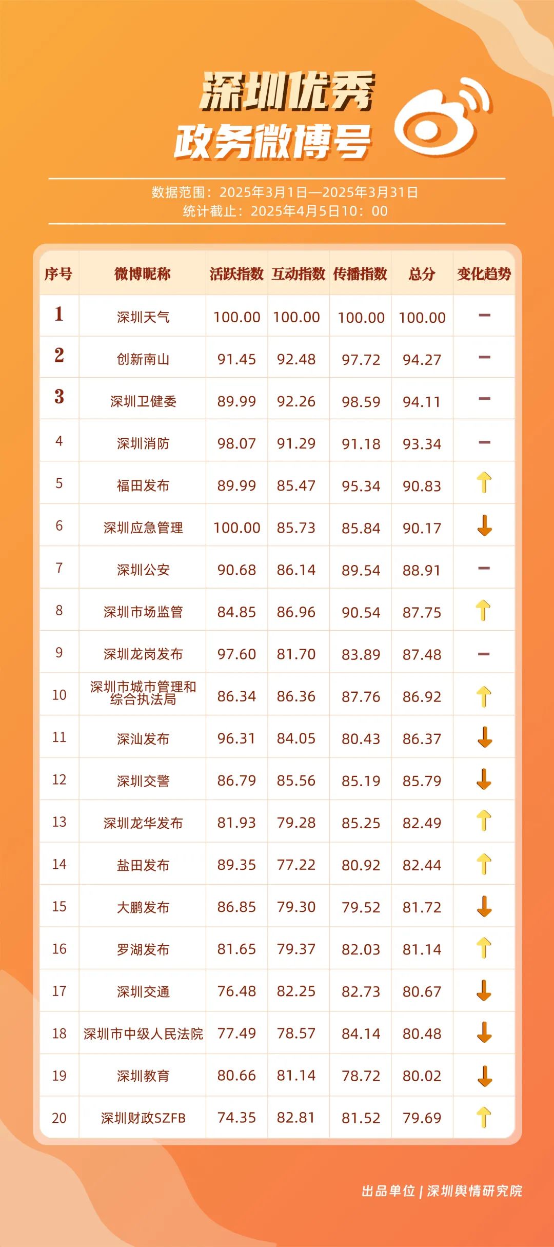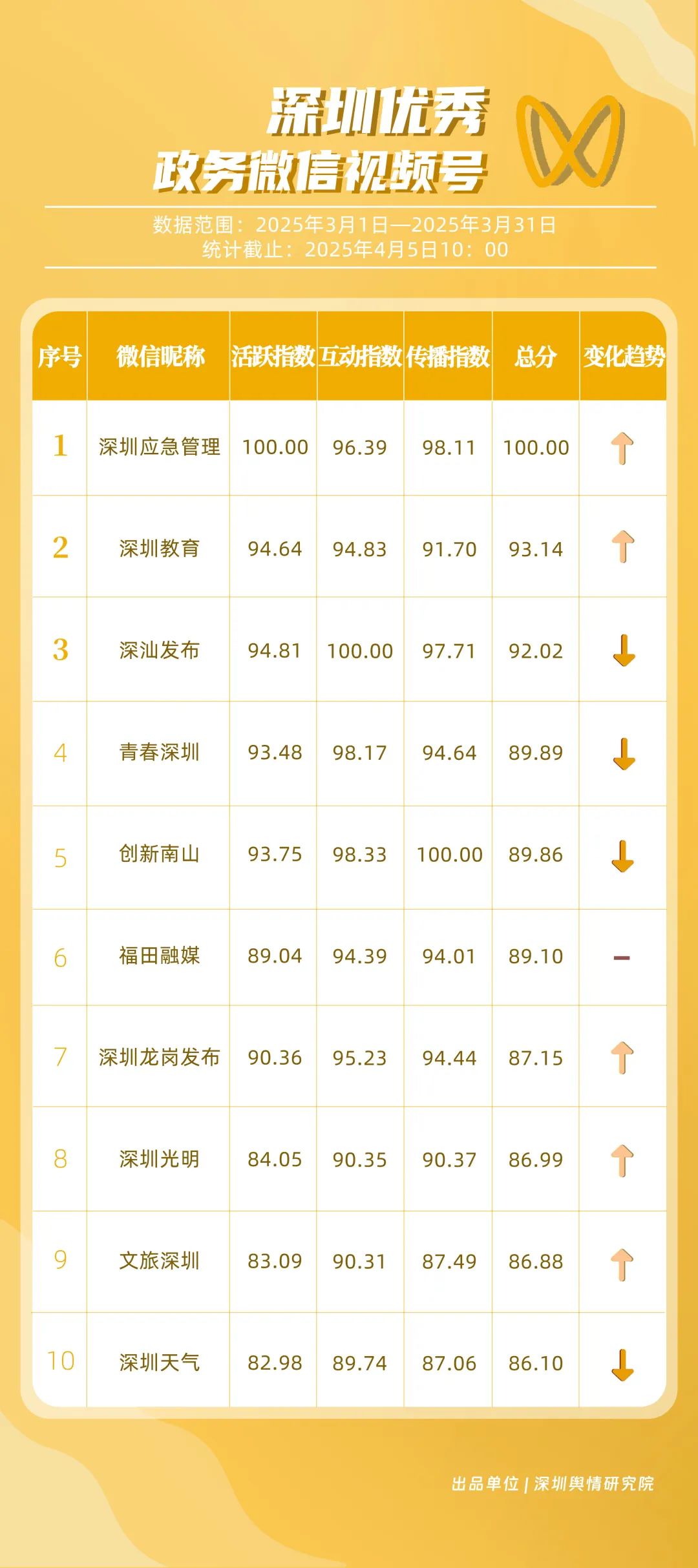 3月,市衛(wèi)生健康委、龍崗區(qū)、市氣象局、深汕特別合作區(qū)、南山區(qū)、福田區(qū)、市應(yīng)急管理局、龍華區(qū)、寶安區(qū)、光明區(qū)榮登“深圳優(yōu)秀政務(wù)新媒體矩陣”榜單。3月,市衛(wèi)生健康委新媒體矩陣持續(xù)關(guān)注市民身心健康,發(fā)布健康科普內(nèi)容,穩(wěn)居榜單第一位;龍崗區(qū)新媒體矩陣在抖音、微信視頻號(hào)平臺(tái)發(fā)力宣傳,躍居榜單第二位;市氣象局新媒體矩陣在微博平臺(tái)連續(xù)多期獲得滿分,持續(xù)以氣象預(yù)警與生活指南結(jié)合的內(nèi)容模式,為市民帶來便利信息。以上賬號(hào)在“深圳優(yōu)秀政務(wù)新媒體矩陣”榜單中榮獲前三名。此外,深汕特別合作區(qū)新媒體矩陣積極發(fā)布網(wǎng)絡(luò)熱點(diǎn)內(nèi)容,收獲較多網(wǎng)民關(guān)注分享;南山區(qū)新媒體矩陣多平臺(tái)實(shí)力強(qiáng)勁,以88.37分居于榜單第五位。值得關(guān)注的是,寶安區(qū)新媒體矩陣時(shí)隔多期躋身榜單前十名,多平臺(tái)均衡發(fā)展成效初顯。