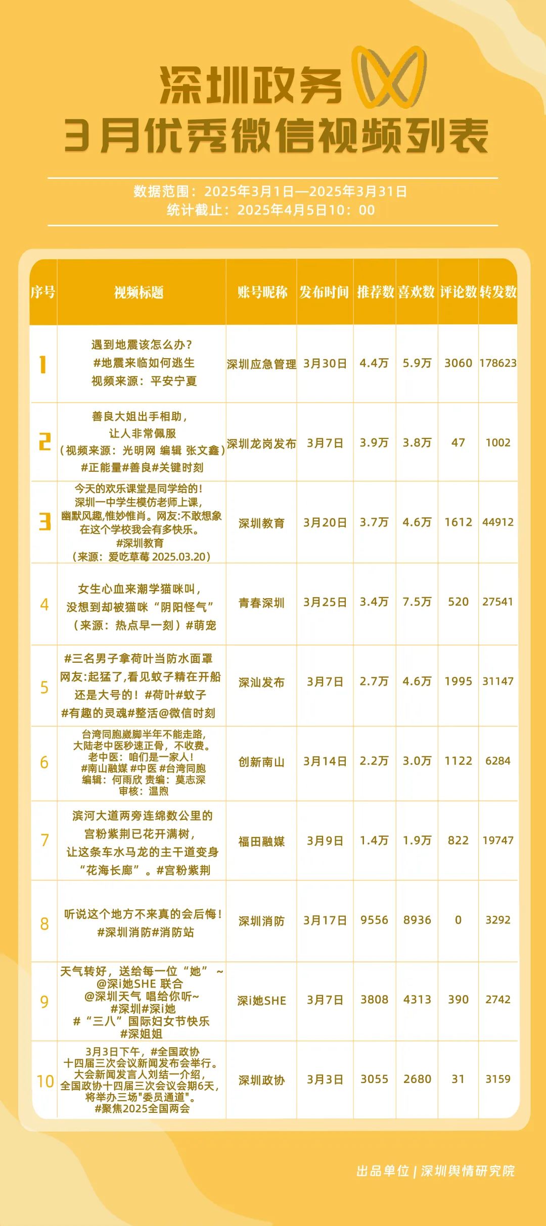 3月,獲“深圳優(yōu)秀政務(wù)微信視頻號(hào)”稱號(hào)的分別是“深圳應(yīng)急管理”“深圳教育”“深汕發(fā)布”“青春深圳”“創(chuàng)新南山”“福田融媒”“深圳龍崗發(fā)布”“深圳光明”“文旅深圳”“深圳天氣”。其中,“深圳應(yīng)急管理”以20余篇作品收獲超20萬次轉(zhuǎn)發(fā),躍居第一名,一期有關(guān)“地震來臨如何逃生”的視頻收獲超17萬次轉(zhuǎn)發(fā),展現(xiàn)了其內(nèi)容的高實(shí)用性。“深圳教育”“深汕發(fā)布”位于榜單第二、三位,總分超90分,反映出兩賬號(hào)在民生教育、區(qū)域宣傳領(lǐng)域擁有較好傳播效果。“青春深圳”“創(chuàng)新南山”“福田融媒”等賬號(hào)也在3月發(fā)布優(yōu)質(zhì)視頻內(nèi)容,展現(xiàn)了深圳政務(wù)新媒體在視頻號(hào)平臺(tái)宣傳的創(chuàng)新探索。