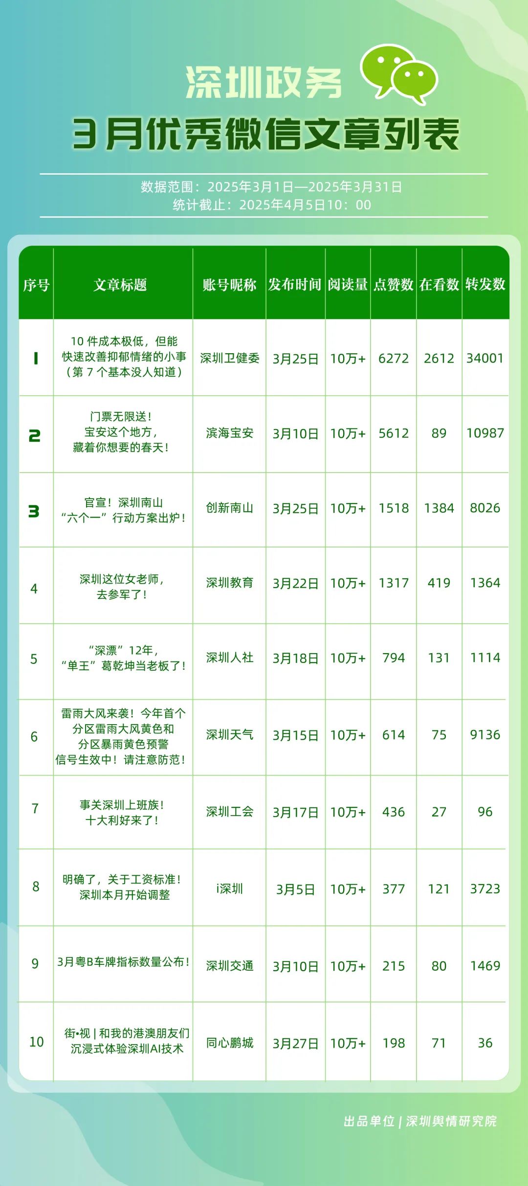 3月,包括“深圳衛(wèi)健委”“深圳龍崗發(fā)布”“幸福福田”“創(chuàng)新南山”“i深圳”“濱海寶安”“青春深圳”“深圳光明”“深圳龍華”“深圳教育”等在內(nèi)的30個(gè)賬號(hào)入選“深圳優(yōu)秀政務(wù)微信公眾號(hào)”。其中,“深圳衛(wèi)健委”超70篇文章閱讀量達(dá)10萬次以上,穩(wěn)居榜單首位;“深圳龍崗發(fā)布”也取得較好傳播效果,在3月產(chǎn)出10余篇閱讀量超10萬次的熱門文章,位于榜單第二位;“幸福福田”也積極發(fā)布高質(zhì)量內(nèi)容,穩(wěn)住榜單第三位置;緊隨其后的是“創(chuàng)新南山”“i深圳”“濱海寶安”,總分均在85分以上。這充分展現(xiàn)了深圳新媒體傳播生態(tài)體系中,各主體的傳播優(yōu)勢(shì)與影響力版圖正逐漸凸顯。