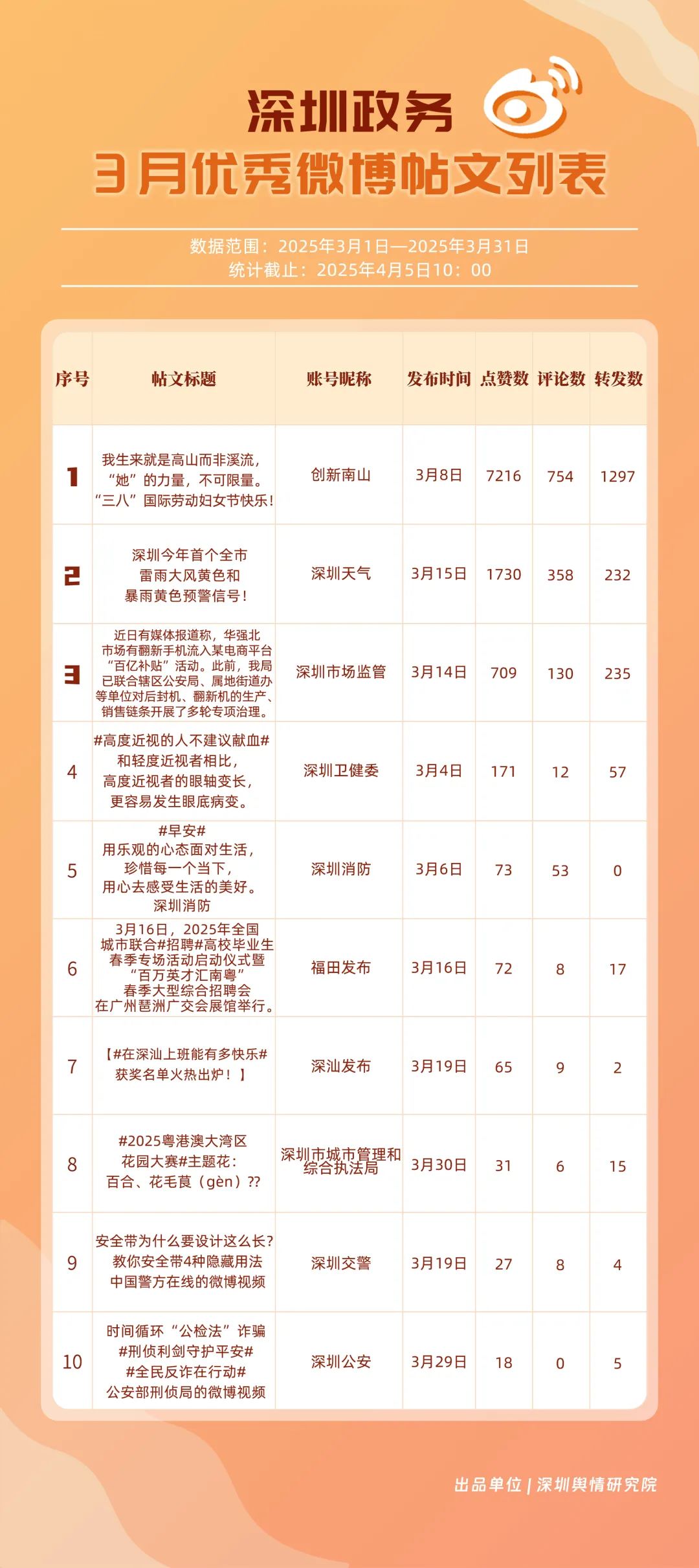 3月,“深圳天氣”“創(chuàng)新南山”“深圳衛(wèi)健委”“深圳消防”“福田發(fā)布”“深圳應(yīng)急管理”“深圳公安”“深圳市場(chǎng)監(jiān)管”“深圳龍崗發(fā)布”“深圳市城市管理和綜合執(zhí)法局”等20個(gè)賬號(hào)入選“優(yōu)秀政務(wù)微博號(hào)”。值得一提的是,“深圳天氣”賬號(hào)在3月共獲得點(diǎn)贊超11萬,相較其他賬號(hào)具備顯著優(yōu)勢(shì)?!皠?chuàng)新南山”“深圳衛(wèi)健委”“深圳消防”也位列前茅,分差微小,競(jìng)爭激烈。從領(lǐng)域分布來看,上榜賬號(hào)不僅包括區(qū)級(jí)賬號(hào),還涵蓋民生服務(wù)、應(yīng)急科普、城市治理等單位賬號(hào),體現(xiàn)了深圳政務(wù)新媒體在多領(lǐng)域的強(qiáng)大影響力。