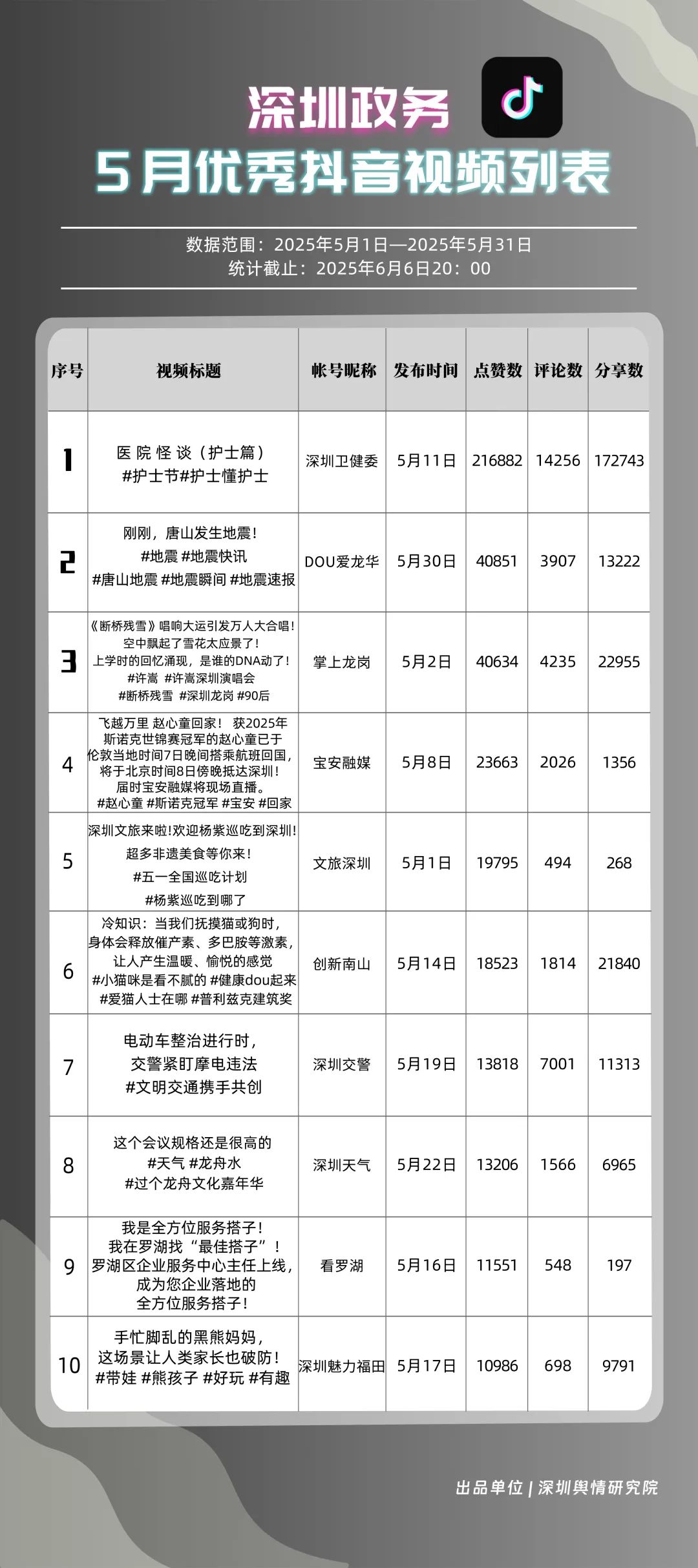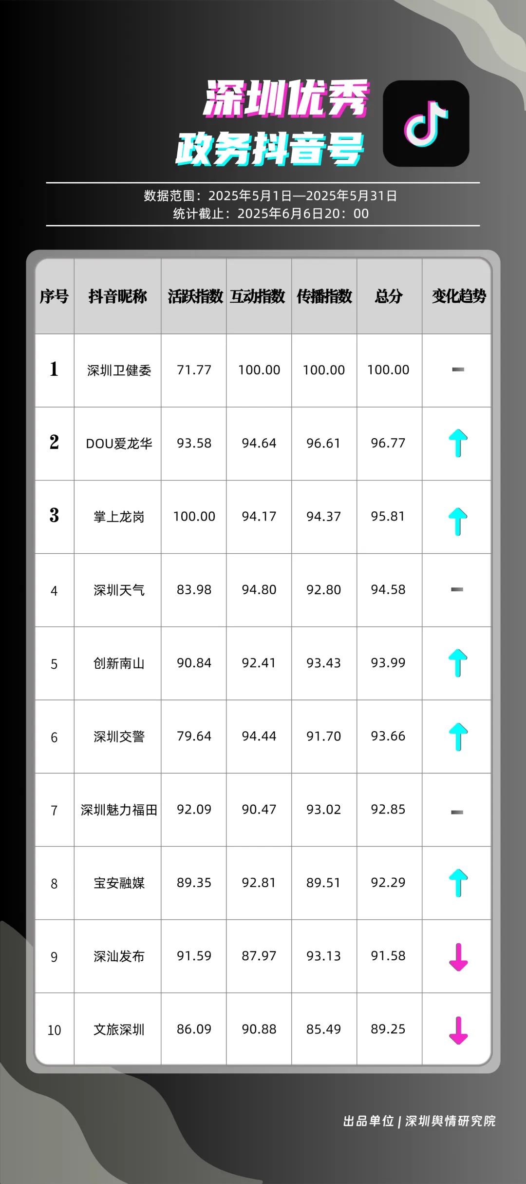 5月,“深圳衛(wèi)健委”“DOU愛龍華”“掌上龍崗”“深圳天氣”“創(chuàng)新南山”“深圳交警”“深圳魅力福田”“寶安融媒”“深汕發(fā)布”“文旅深圳”共10個政務(wù)抖音號獲得“優(yōu)秀政務(wù)抖音號”稱號。5月,“深圳衛(wèi)健委”憑借3條極具創(chuàng)意的視頻內(nèi)容持續(xù)收獲網(wǎng)民關(guān)注,穩(wěn)居榜首之位,成為政務(wù)抖音號領(lǐng)域的標(biāo)桿。“DOU愛龍華”“掌上龍崗”較上個月排名大幅度上升,以96.77分和95.81分位居榜單第2、3名,彰顯出積極探索創(chuàng)新傳播路徑、開拓政務(wù)短視頻發(fā)展新可能的決心。以上優(yōu)秀政務(wù)抖音號通過多樣化的短視頻形式傳遞政務(wù)資訊,為深圳政務(wù)新媒體在短視頻領(lǐng)域的蓬勃發(fā)展注入強(qiáng)勁動能,成為政務(wù)信息傳播的新標(biāo)桿。