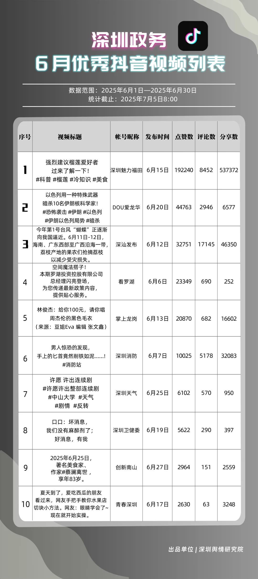 6月,“深圳魅力福田”“DOU愛(ài)龍華”“深汕發(fā)布”“掌上龍崗”“深圳天氣”“深圳消防”“創(chuàng)新南山”“青春深圳”“深圳交警”“看羅湖”共10個(gè)政務(wù)抖音號(hào)獲得“優(yōu)秀政務(wù)抖音號(hào)”稱(chēng)號(hào)。6月,“深圳魅力福田”登頂,憑借其城市人文、社會(huì)熱點(diǎn)類(lèi)主題短視頻,在傳播指數(shù)得分創(chuàng)新高;“DOU愛(ài)龍華”“深汕發(fā)布”“掌上龍崗”緊隨其后,通過(guò)各類(lèi)熱點(diǎn)、創(chuàng)意內(nèi)容提升傳播效能。“深圳天氣”“深圳消防”也表現(xiàn)突出,短視頻內(nèi)容兼具“信息傳遞”與“情感共鳴”,用戶(hù)參與度持續(xù)提升,不斷為網(wǎng)民傳播有價(jià)值的政務(wù)信息資訊。