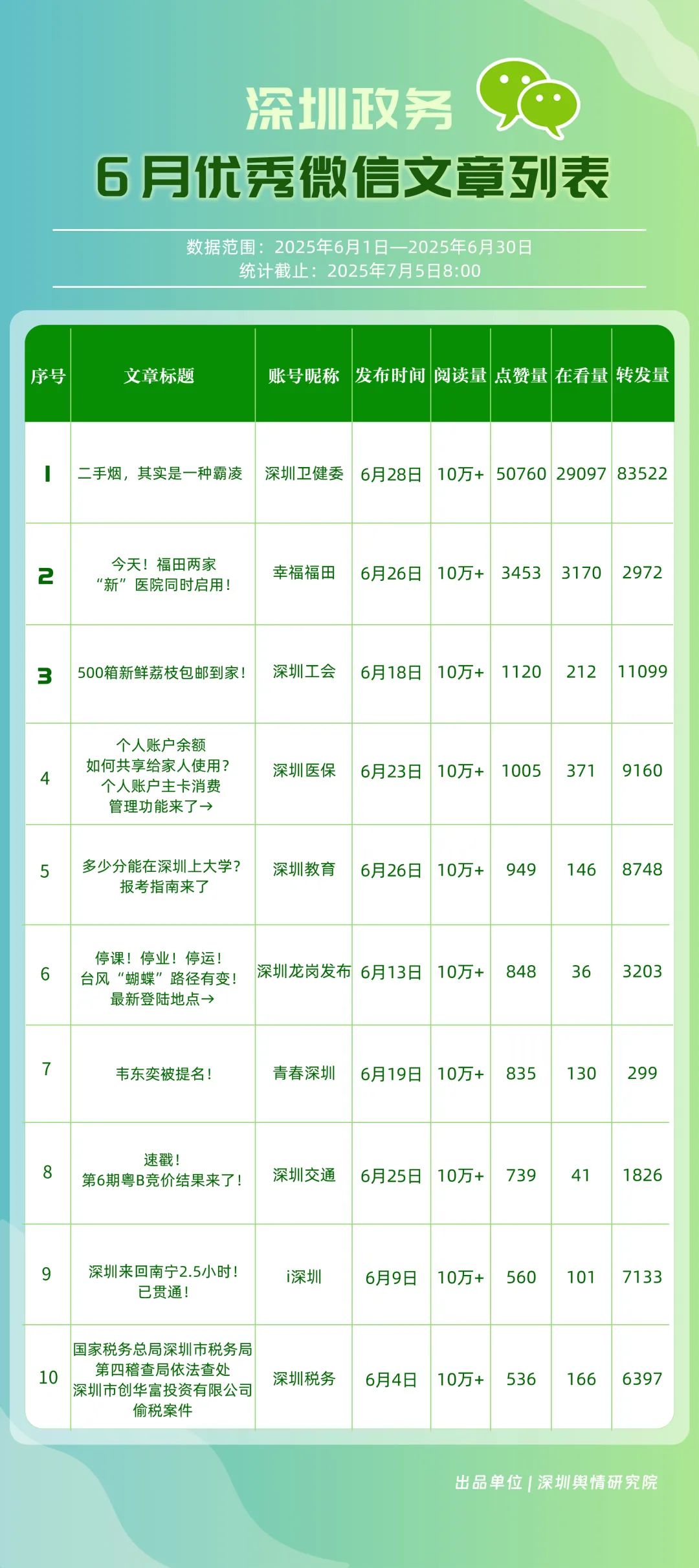 6月,30個(gè)政務(wù)微信公眾號(hào)入選“深圳優(yōu)秀政務(wù)微信公眾號(hào)”榜單,其中包括“深圳衛(wèi)健委”“幸福福田”“深圳龍崗發(fā)布”“i深圳”“創(chuàng)新南山”“青春深圳”“深圳光明”“深圳教育”“深圳龍華”“深圳工會(huì)”等。6月,榜單前三名的賬號(hào)保持穩(wěn)定,且各創(chuàng)作出多篇閱讀量超10萬(wàn)次的優(yōu)質(zhì)文章,傳播指數(shù)得分均在100分以上?!吧钲谛l(wèi)健委”持續(xù)位居榜首,內(nèi)容專(zhuān)業(yè)性與傳播力持續(xù)領(lǐng)跑;“幸福福田”以92.94分位居第二,得分較5月有所提高?!吧钲邶垗彴l(fā)布”“i深圳”“創(chuàng)新南山”也積極發(fā)布民生服務(wù)與宣傳活動(dòng)內(nèi)容,排名靠前。上榜賬號(hào)整體呈現(xiàn)“內(nèi)容精品化、服務(wù)場(chǎng)景化”特點(diǎn),持續(xù)優(yōu)化信息供給質(zhì)量,為用戶(hù)打造有深度的政務(wù)信息服務(wù)矩陣。