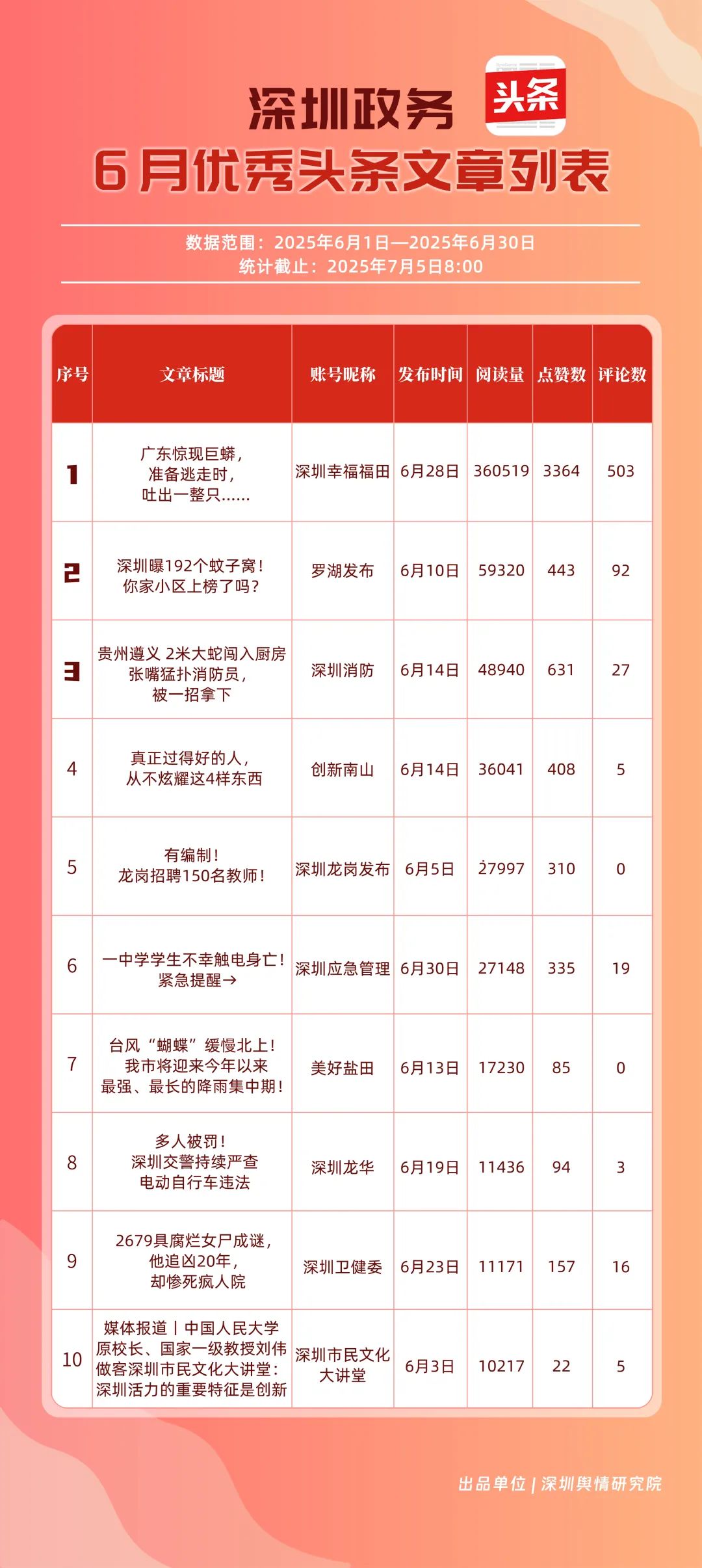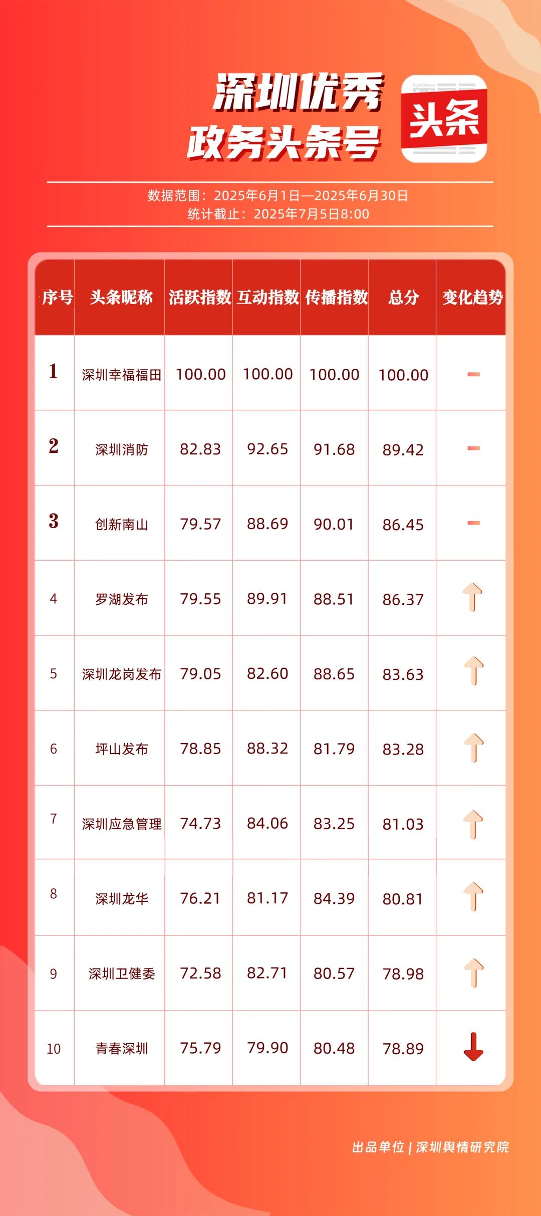 6月,“深圳幸福福田”“深圳消防”“創(chuàng)新南山”“羅湖發(fā)布”“深圳龍崗發(fā)布”“坪山發(fā)布”“深圳應(yīng)急管理”“深圳龍華”“深圳衛(wèi)健委”“青春深圳”共10個(gè)政務(wù)頭條號(hào)入選“優(yōu)秀政務(wù)頭條號(hào)”榜單。“深圳幸福福田”“深圳消防”“創(chuàng)新南山”連續(xù)位居榜單前3名,內(nèi)容具備較強(qiáng)的吸引力?!傲_湖發(fā)布”“深圳龍崗發(fā)布”排名也在榜單前列,排名較5月有所上升,在區(qū)域形象宣傳與民生服務(wù)中持續(xù)發(fā)力。