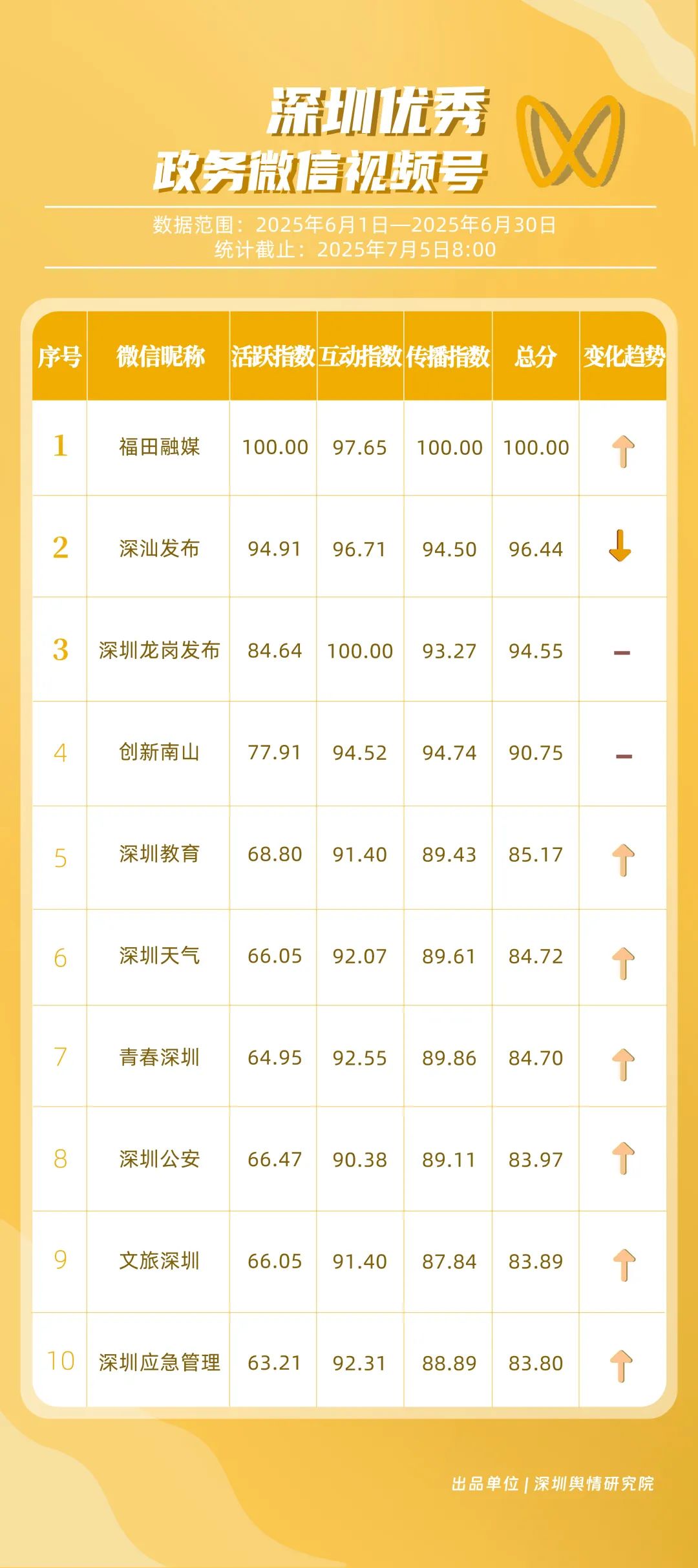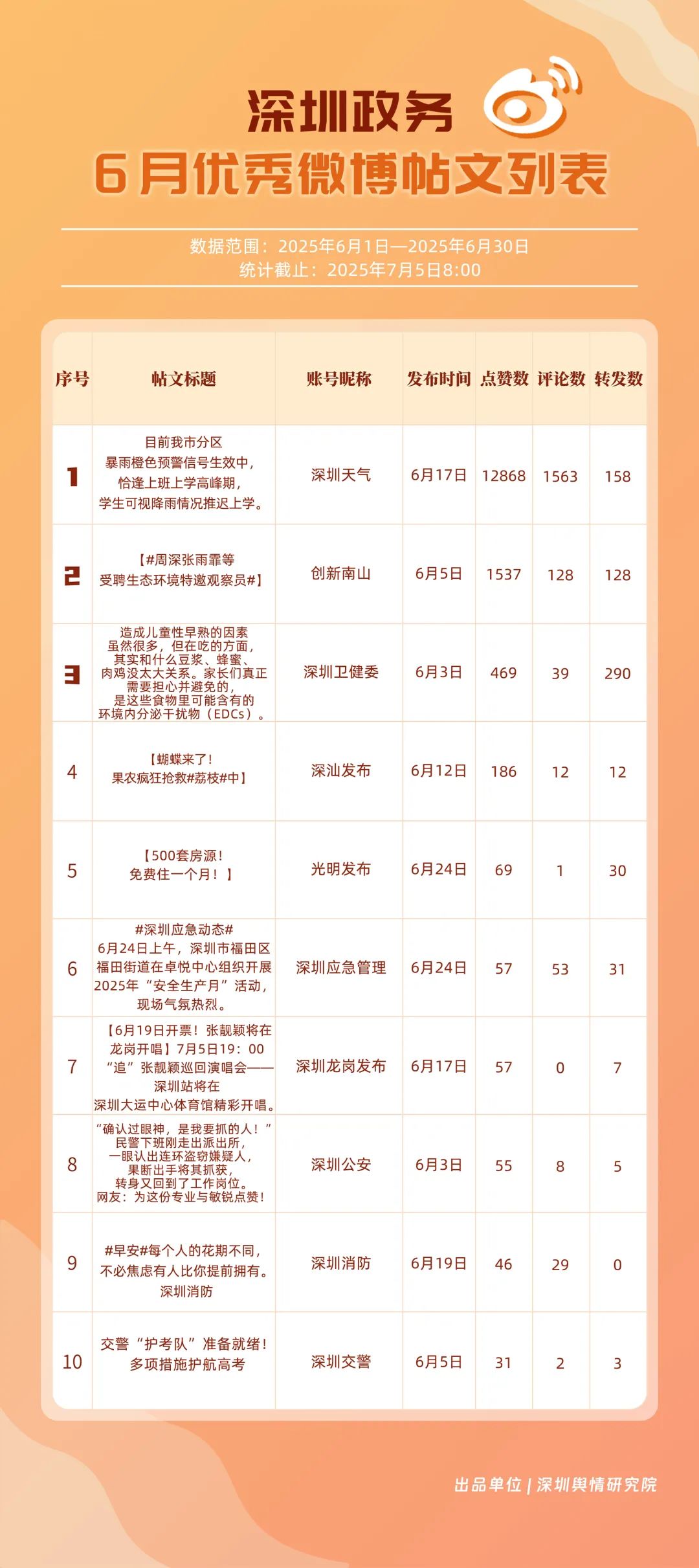 6月,“深圳天氣”“深圳衛(wèi)健委”“深圳消防”“深圳應(yīng)急管理”“創(chuàng)新南山”“深汕發(fā)布”“福田發(fā)布”“深圳公安”“深圳龍崗發(fā)布”“深圳交警”等20個(gè)賬號(hào)入選“優(yōu)秀政務(wù)微博號(hào)”。其中,“深圳天氣”以活躍、互動(dòng)指數(shù)雙滿(mǎn)分穩(wěn)居第一,氣象服務(wù)信息及時(shí)性與科普內(nèi)容趣味性獲市民高度認(rèn)可;“深圳衛(wèi)健委”“深圳消防”“深圳應(yīng)急管理”分別位列2至4位,通過(guò)熱點(diǎn)話(huà)題聯(lián)動(dòng)醫(yī)療、消防、應(yīng)急知識(shí)科普擴(kuò)大影響力,政務(wù)微博矩陣在突發(fā)事件響應(yīng)與民生服務(wù)中作用凸顯。