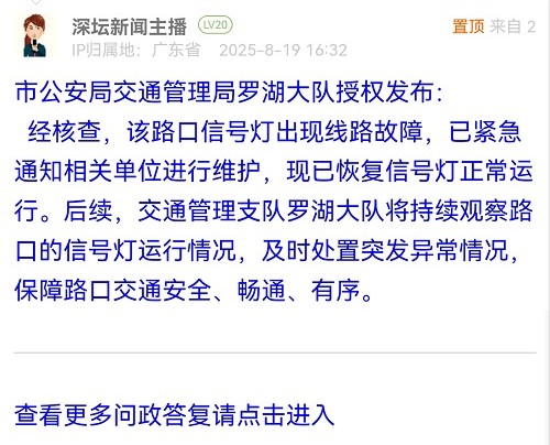 經(jīng)核查,該路口信號燈出現(xiàn)線路故障,已緊急通知相關(guān)單位進行維護,現(xiàn)已恢復(fù)信號燈正常運行。后續(xù),交通管理支隊羅湖大隊將持續(xù)觀察路口的信號燈運行情況,及時處置突發(fā)異常情況,保障路口交通安全、暢通、有序。