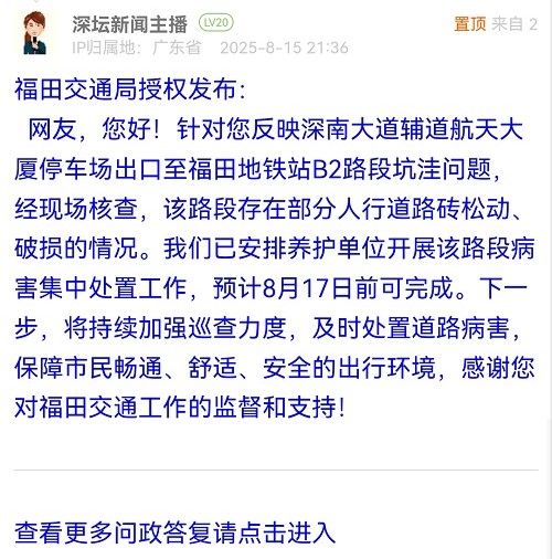 網(wǎng)友,您好!針對您反映深南大道輔道航天大廈停車場出口至福田地鐵站B2路段坑洼問題,經(jīng)現(xiàn)場核查,該路段存在部分人行道路磚松動、破損的情況。我們已安排養(yǎng)護單位開展該路段病害集中處置工作,預(yù)計8月17日前可完成。下一步,將持續(xù)加強巡查力度,及時處置道路病害,保障市民暢通、舒適、安全的出行環(huán)境,感謝您對福田交通工作的監(jiān)督和支持!