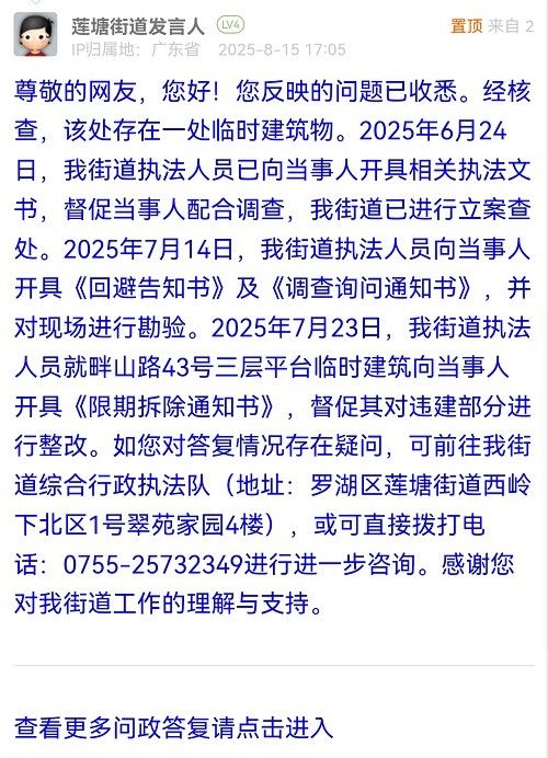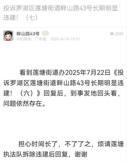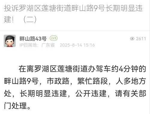 15. 帖文《投訴羅湖區(qū)蓮塘街道畔山路43號長期明顯違建?。ㄆ撸?/a>》