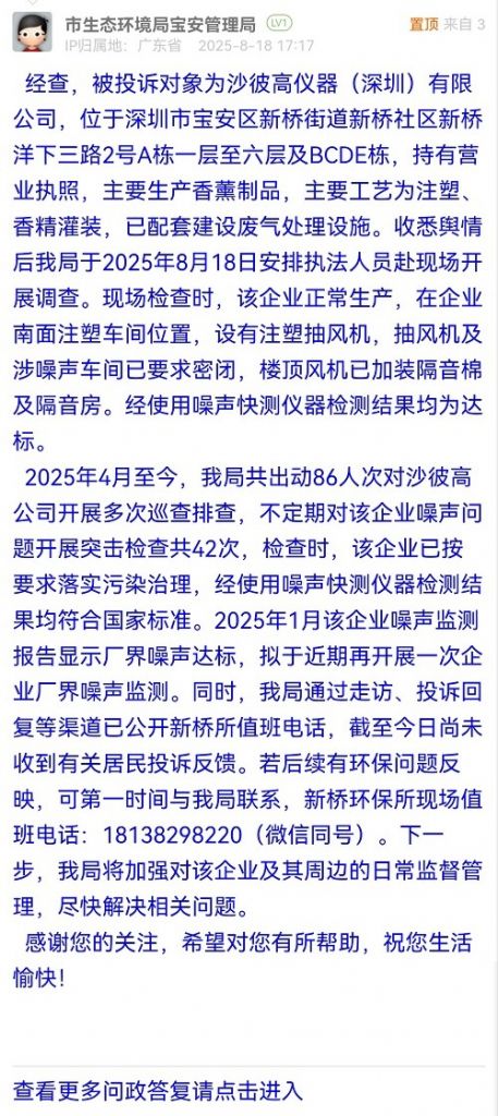 經(jīng)查,被投訴對象為沙彼高儀器(深圳)有限公司,位于深圳市寶安區(qū)新橋街道新橋社區(qū)新橋洋下三路2號A棟一層至六層及BCDE棟,持有營業(yè)執(zhí)照,主要生產(chǎn)香薰制品,主要工藝為注塑、香精灌裝,已配套建設(shè)廢氣處理設(shè)施。收悉輿情后我局于2025年8月18日安排執(zhí)法人員赴現(xiàn)場開展調(diào)查。現(xiàn)場檢查時,該企業(yè)正常生產(chǎn),在企業(yè)南面注塑車間位置,設(shè)有注塑抽風(fēng)機,抽風(fēng)機及涉噪聲車間已要求密閉,樓頂風(fēng)機已加裝隔音棉及隔音房。經(jīng)使用噪聲快測儀器檢測結(jié)果均為達標。