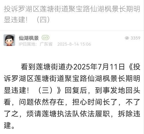 13. 帖文《投訴羅湖區(qū)蓮塘街道聚寶路仙湖楓景長期明顯違建?。ㄋ模?/a>》